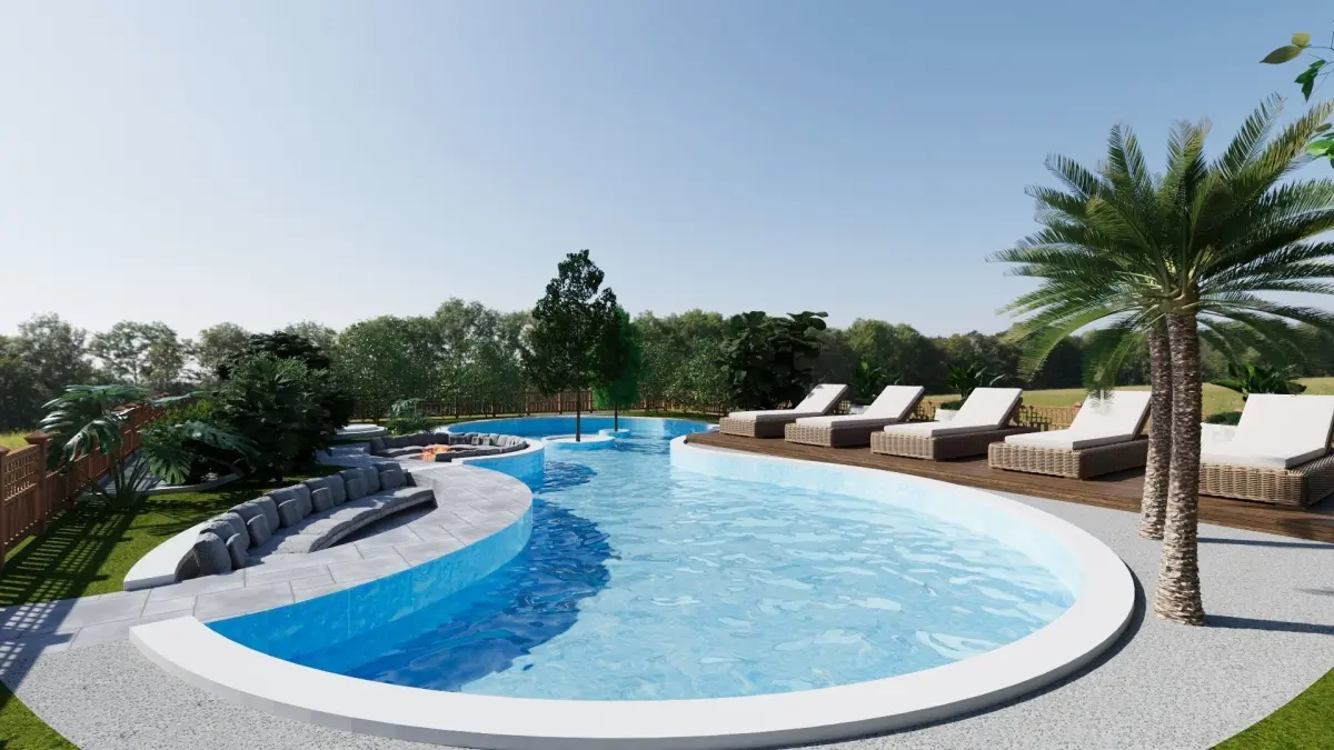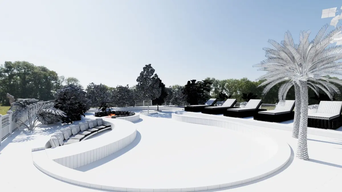 - Curvaceous Elegance: A mesmerizing curved swimming pool takes center stage, inviting you to bask in the sun or take a refreshing dip. Built-in pool seats offer luxurious relaxation, while a charming tree island in the center adds a touch of whimsical delight.