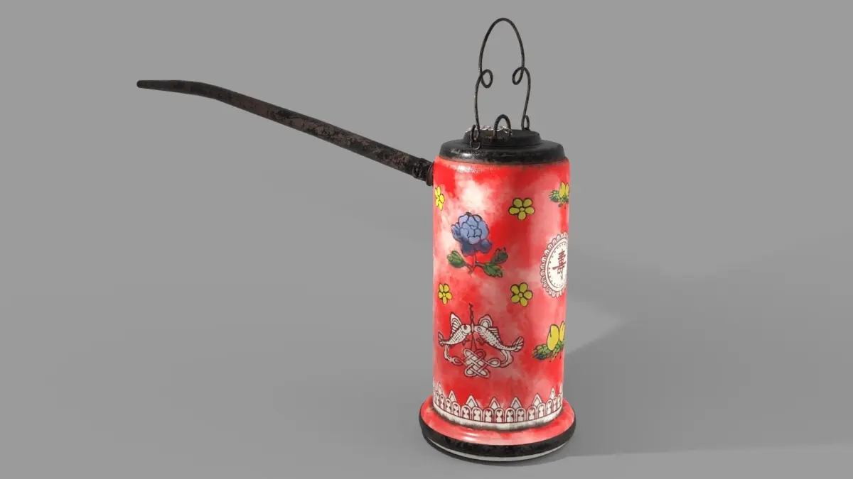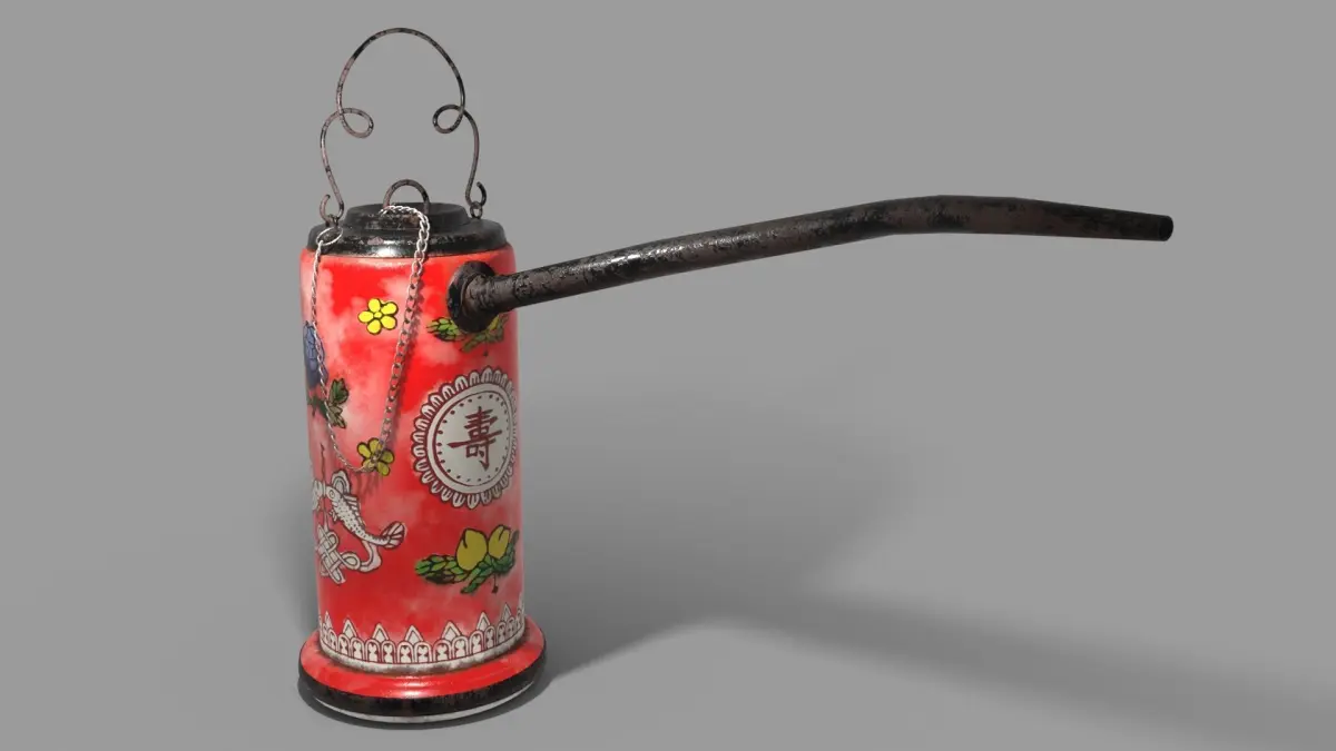 This model is an antique chinese opium pipe, made of porcelain, with beautiful underglaze designs. It dates back to the late 1800s, and was widely used throughout asia in opium dens.