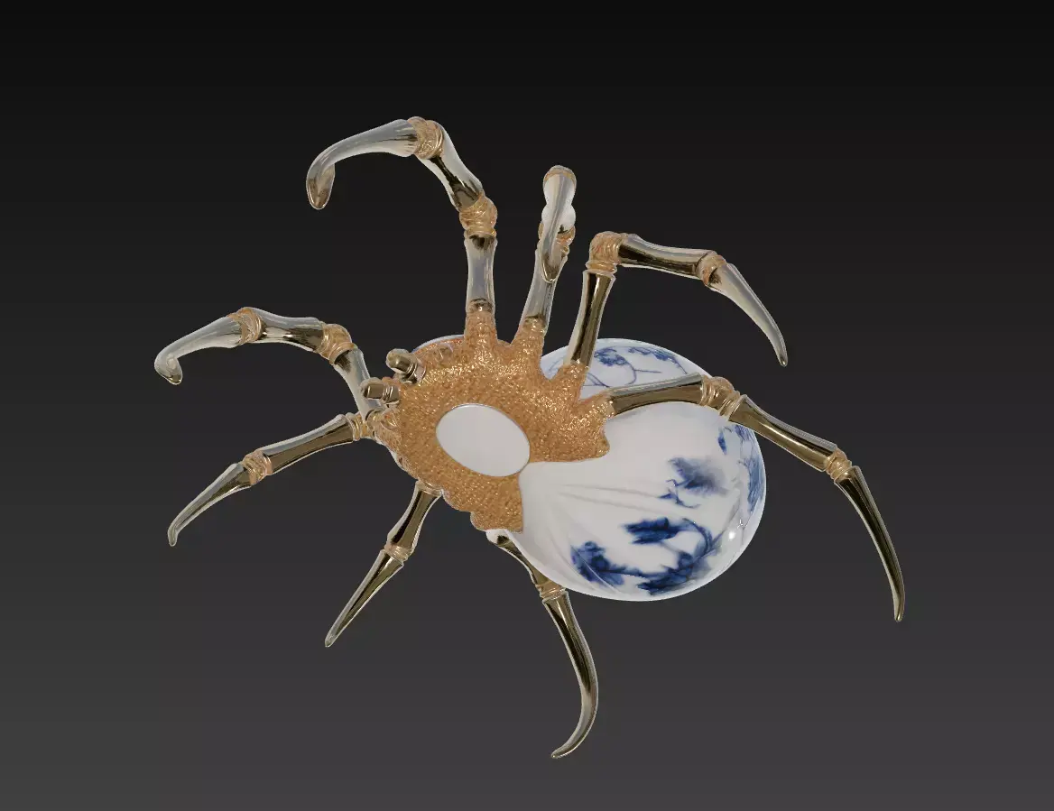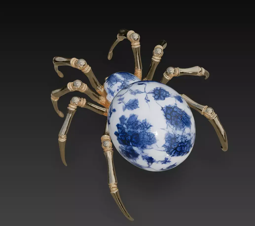 The Porcelain Spider 3D Model blends elegance and fantasy in a unique art concept that combines fine porcelain design with golden mechanical details.Its delicate blue floral patterns contrast beautifully with the sharp metallic legs, symbolizing the intersection of fragility and strength.