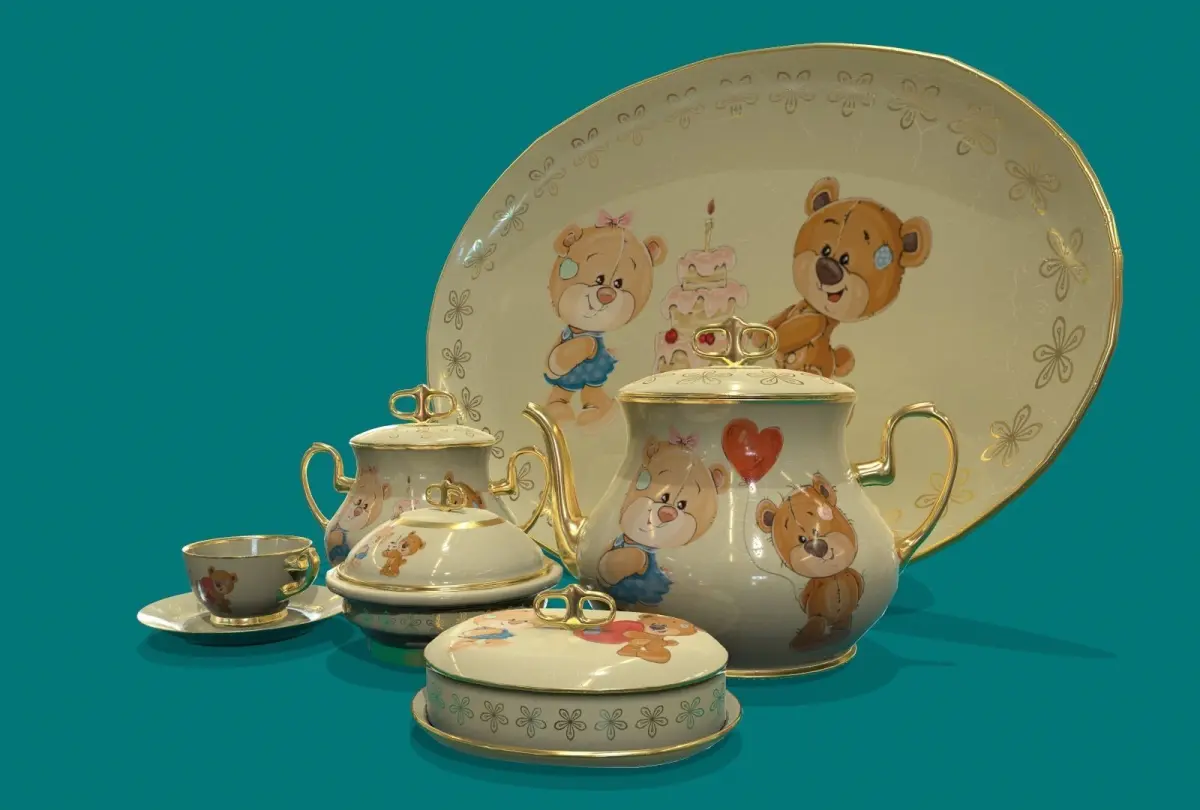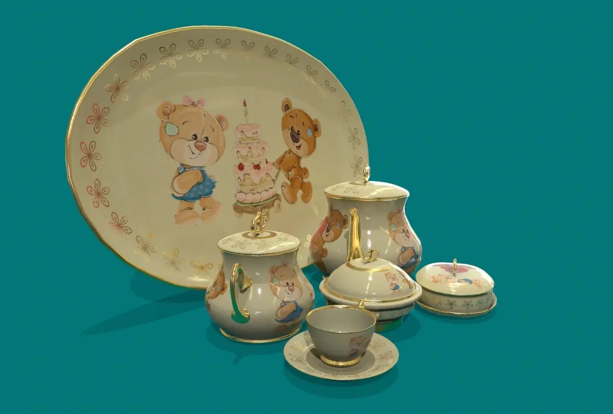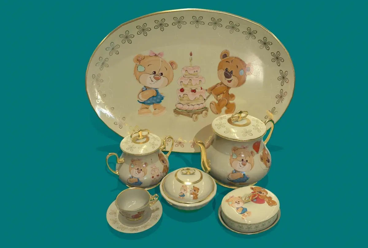High quality 3d models of tea set to decorate your kitchen. The set includes cup, sugar cup, teapot, sauser, Jam Bowl and tray. The models are made with much attention to details. They have reasonable amount of polygons and accurate grid. Geometry: Polygon mesh;Units: Centimeters;Polygons: 44530 Vertex: 44984 Object: Dimension cm: 149cm x 103cm x 101cm. Model parts: 6. Material count: 5 Unwrapped UVs Texture set: Painted in Substance PainterThe package has 4 colors: Light Yellow/Cobalt/Terracota/BluePBR texture sets: 2k/4k .png / Base Color / Metallic / Normal (OpenGL) / Roughnes/Ambient_occlusion. Available formats: *.fbx; *.obj; *.dae; *.gltf;