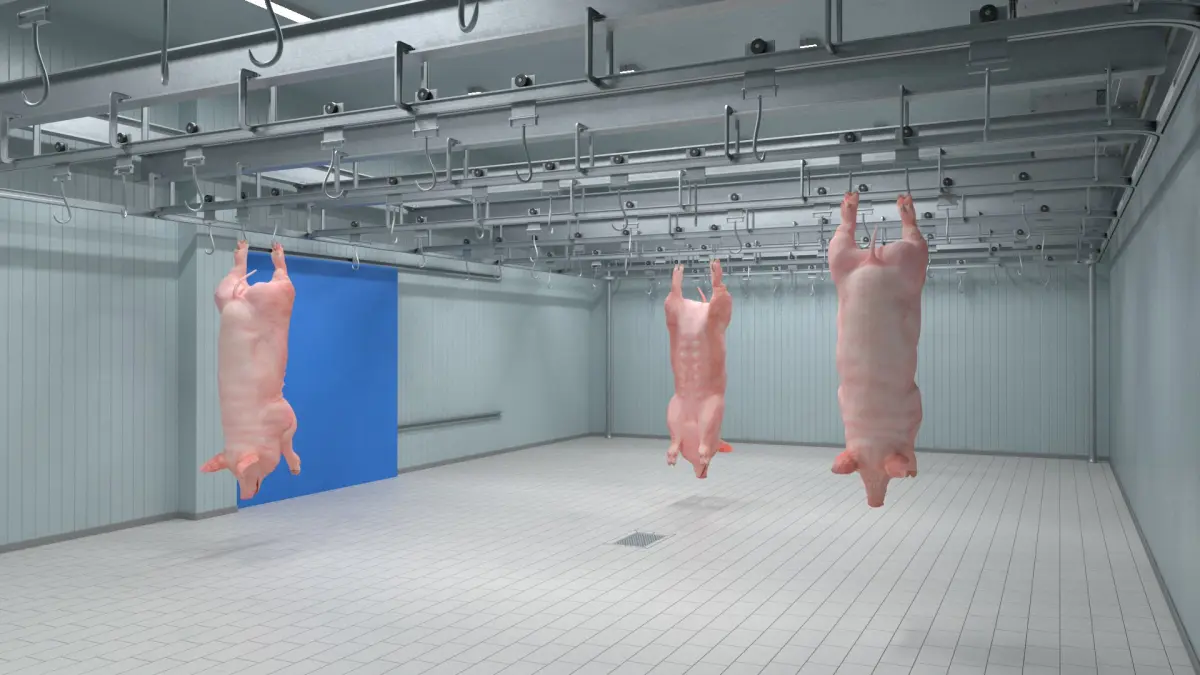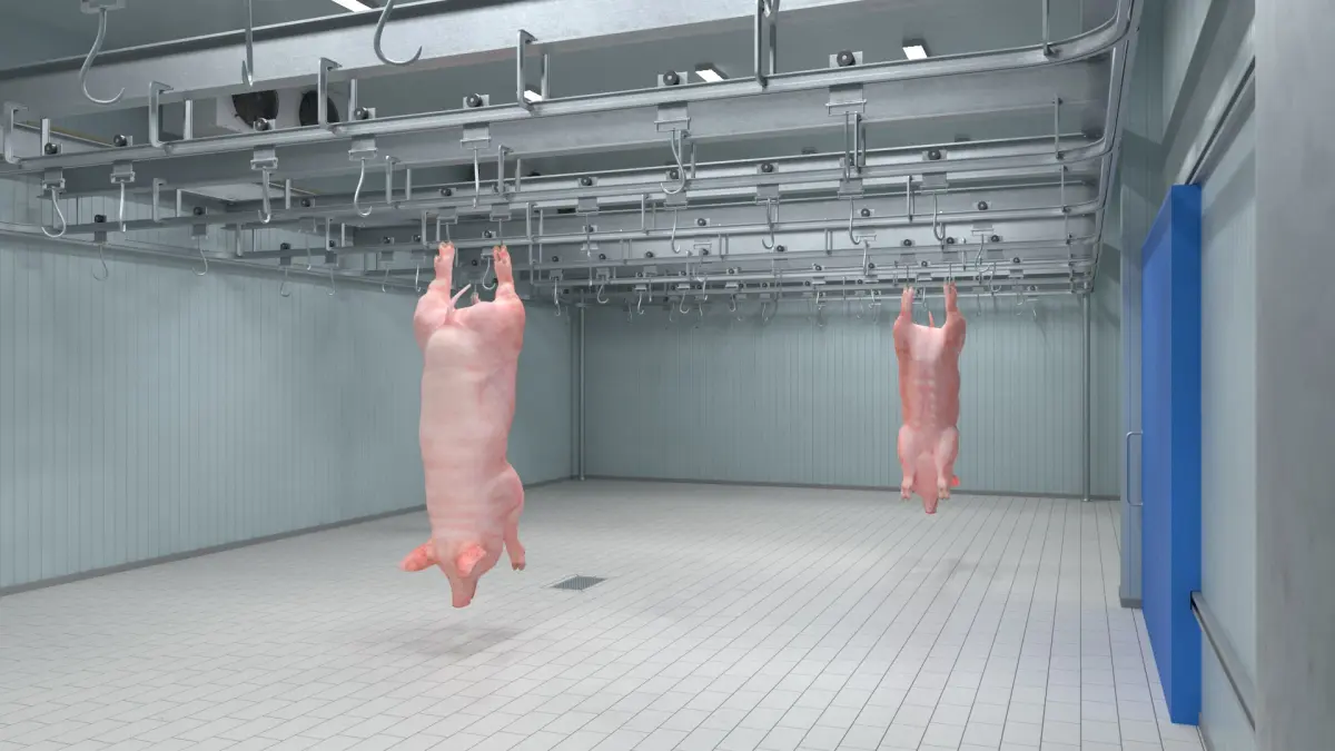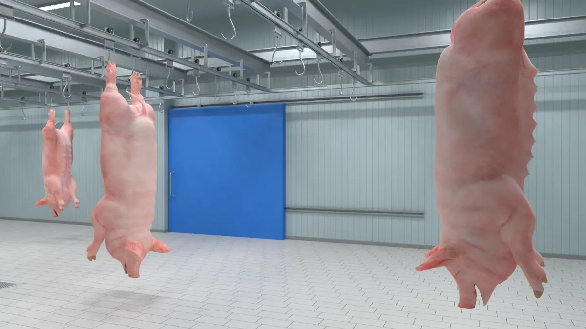 For meat processing visualization, cold chain logistics, butchery facility planning, refrigeration systems layout, commercial kitchen design, food industry VR training, product marketing, and simulation-based safety presentations.