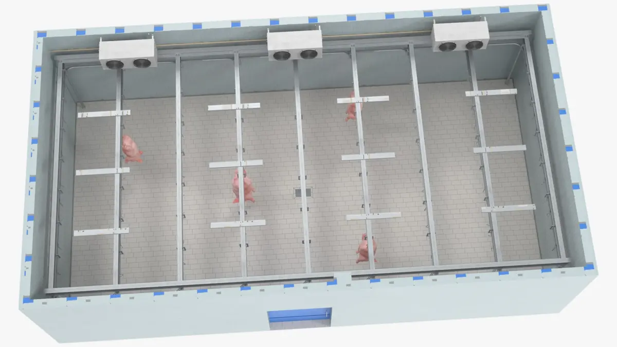Pork Carcass Cold Storage Room with Hook Rail is a three-dimensional model of an industrial-grade refrigeration chamber outfitted for meat hanging and preservation.