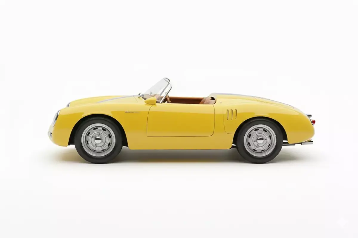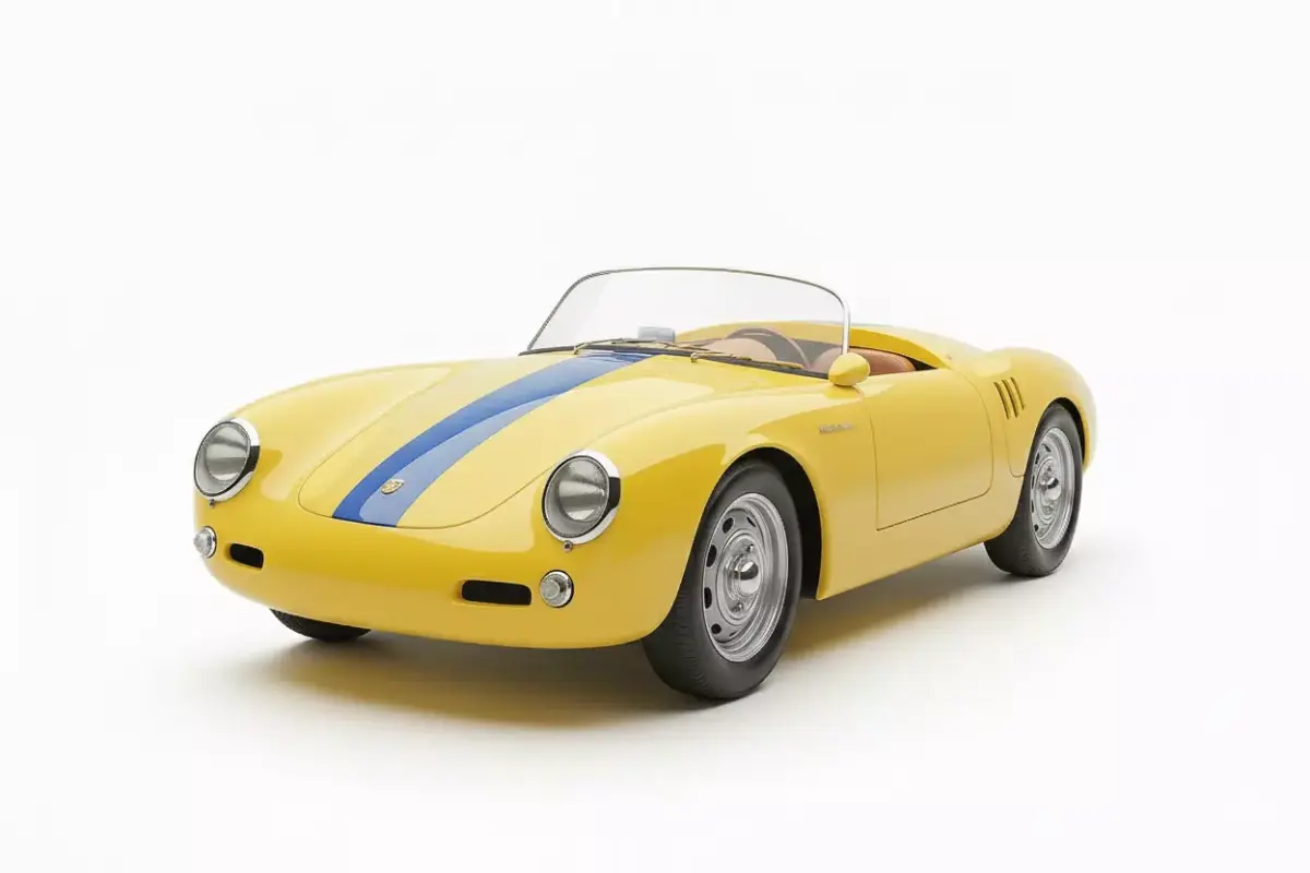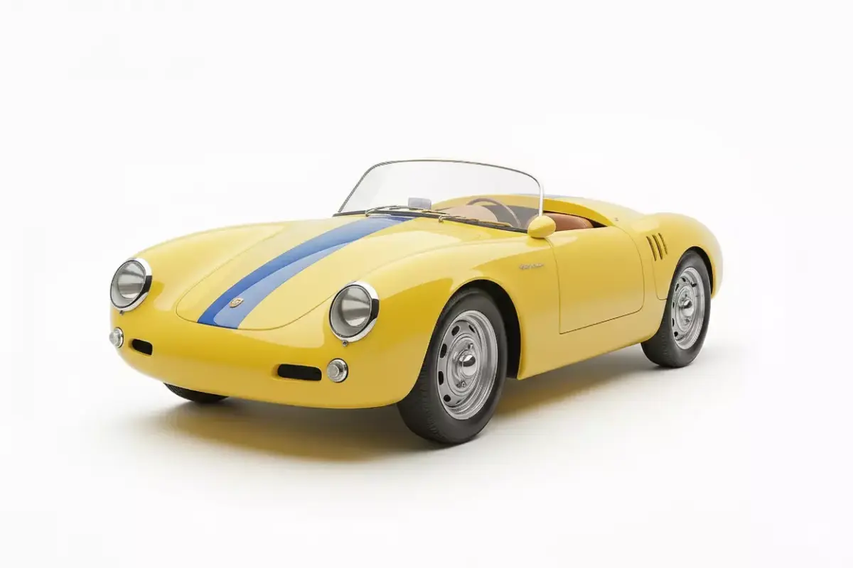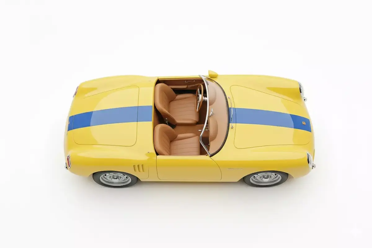This is a stunning, high-fidelity 3D model of the legendary Porsche 550 Spyder, a classic two-seater race car from the mid-1950s. The model is finished in a vibrant, period-appropriate yellow livery with a distinctive central blue racing stripe running over the bonnet and rear deck. Known for its lightweight design and groundbreaking Type 547 Fuhrmann four-cam engine, this open-top roadster features minimalist styling, a low-slung body, and classic round headlamps. The interior is visible with rich, light brown upholstery. Rendered on a clean white background, the model captures the timeless elegance and aggressive racing spirit of one of Porsche's most iconic and historically significant vehicles. This asset is perfect for classic automotive visualization, historical simulations, or high-end rendering projects.