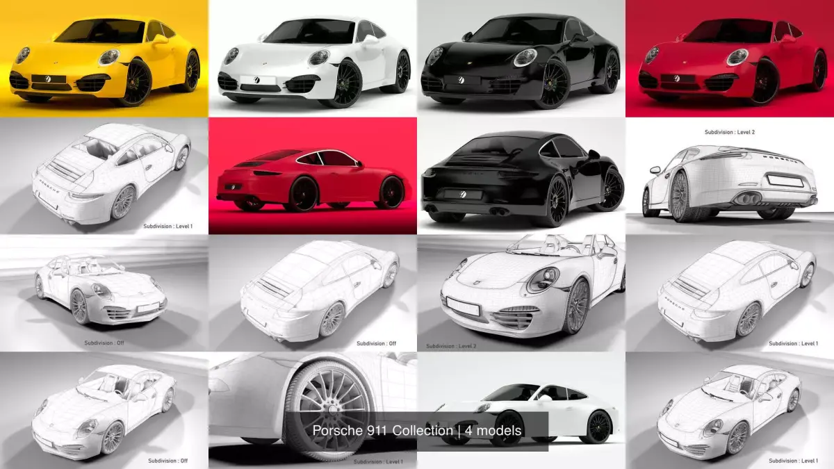 A collection of 3D models of Porsche 911, flawless models and props. Car are high quality, photo-real models that will add detail and realism to any of your render projects. Completely premium crafted cars models. Precisely designed. originally. And the scene is set for every file format (except fbx and obj). Every part of the model is available for anti-aliasing and you can manually adjust the detail/softness of the model. Everything is in batches and unit cm to avoid confusion. Scenes come pre-loaded and ready to be processed with one click. It will make your project more stylish and more realistic. The texture files are given alongside. The model has a fully textured, detailed design. These are close-up renders, originally modeled in Cinema 4D and 3ds Max and rendered with Corona, Standard and V-Ray. All the adjustments are made for you and you can start using the product from the moment you download it. This topology is fully optimized and can be opened by any computer. .The product comes to you without anti-aliasing. For anti-aliasing, you can apply Subdivision Surface in Cinema 4D and MeshSmooth in 3ds Max. Models are also sold separately.