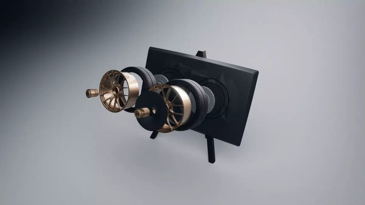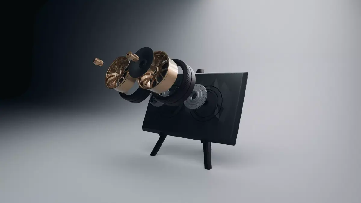 This display features two contrasting wheel designs—a classic mesh spoke and a modern turbofan aero cover—presented in a dynamic, layered exploded view. The high-detail rims, tires, and brake assemblies are mounted on a sleek frame resembling an artist's easel.