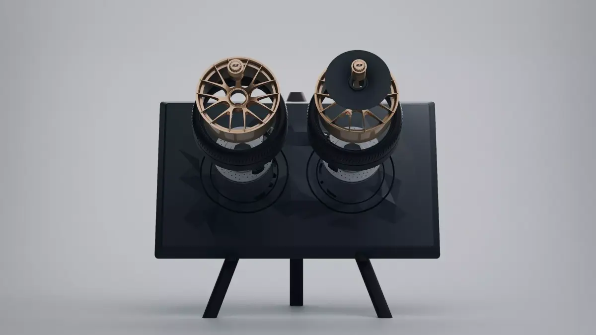 This display features two contrasting wheel designs—a classic mesh spoke and a modern turbofan aero cover—presented in a dynamic, layered exploded view. The high-detail rims, tires, and brake assemblies are mounted on a sleek frame resembling an artist's easel.