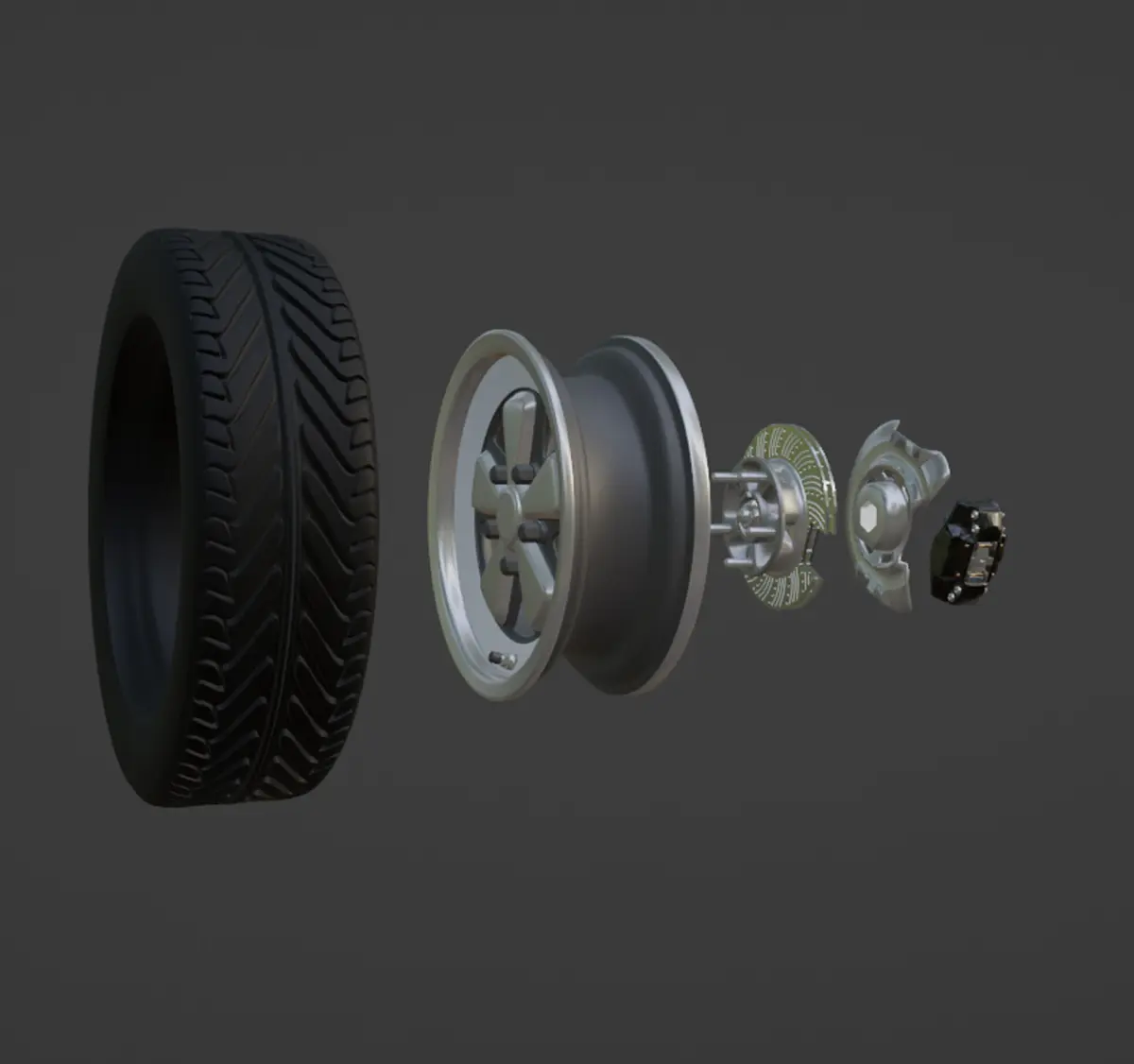 It comes with a generic Tyre, Brake disc and caliper. With a heat shield / protection plate