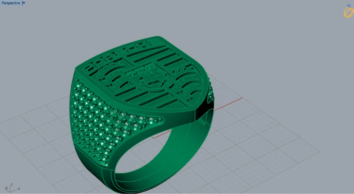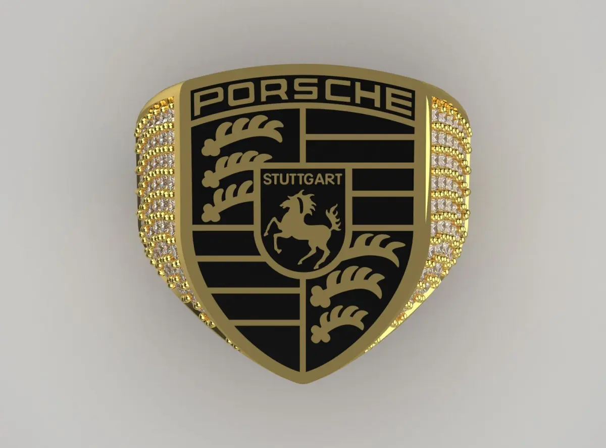 This image shows a luxurious, gold ring featuring the Porsche crest on its top surface. The crest is prominently displayed, with intricate detailing, and is surrounded by a section encrusted with multiple small, sparkling diamonds, giving the ring an opulent appearance. The ring’s design combines sporty elegance with high-end jewelry craftsmanship.