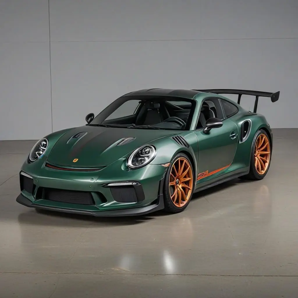 Porsha 911 GT3 car with dark green sheddy color.The Porsche 911 GT3 in dark shady green exudes an aura of sophistication and power, blending sleek design with high performance for an unparalleled driving experience.