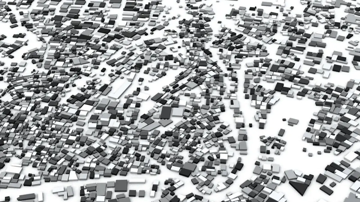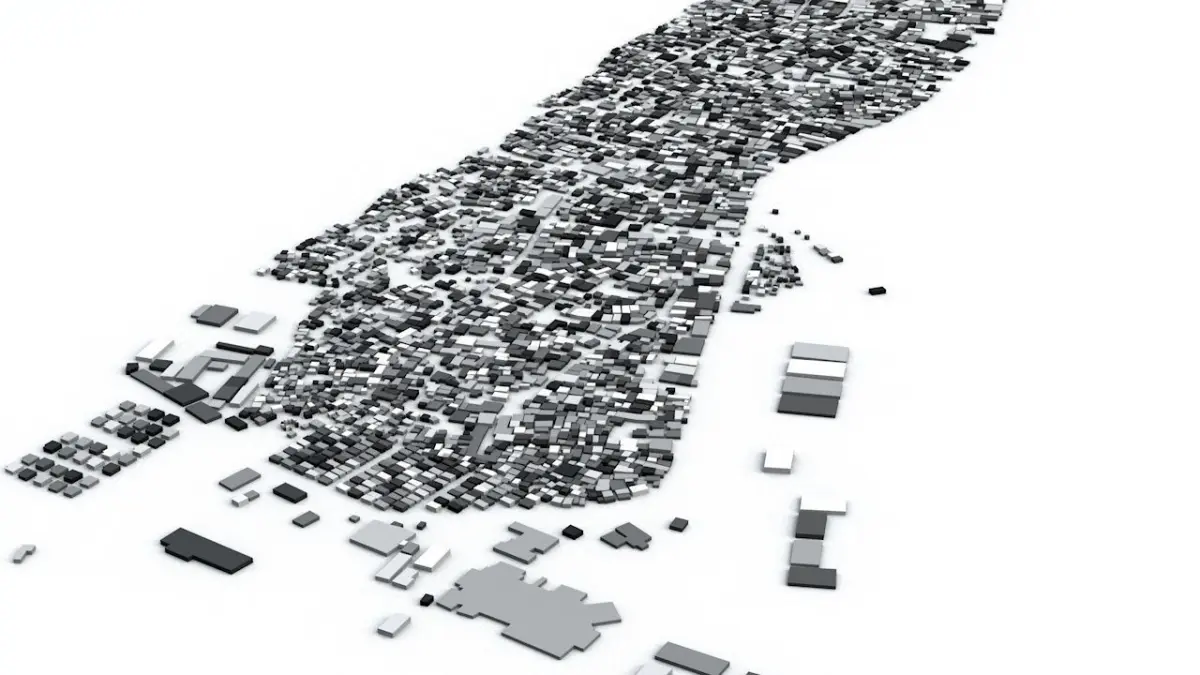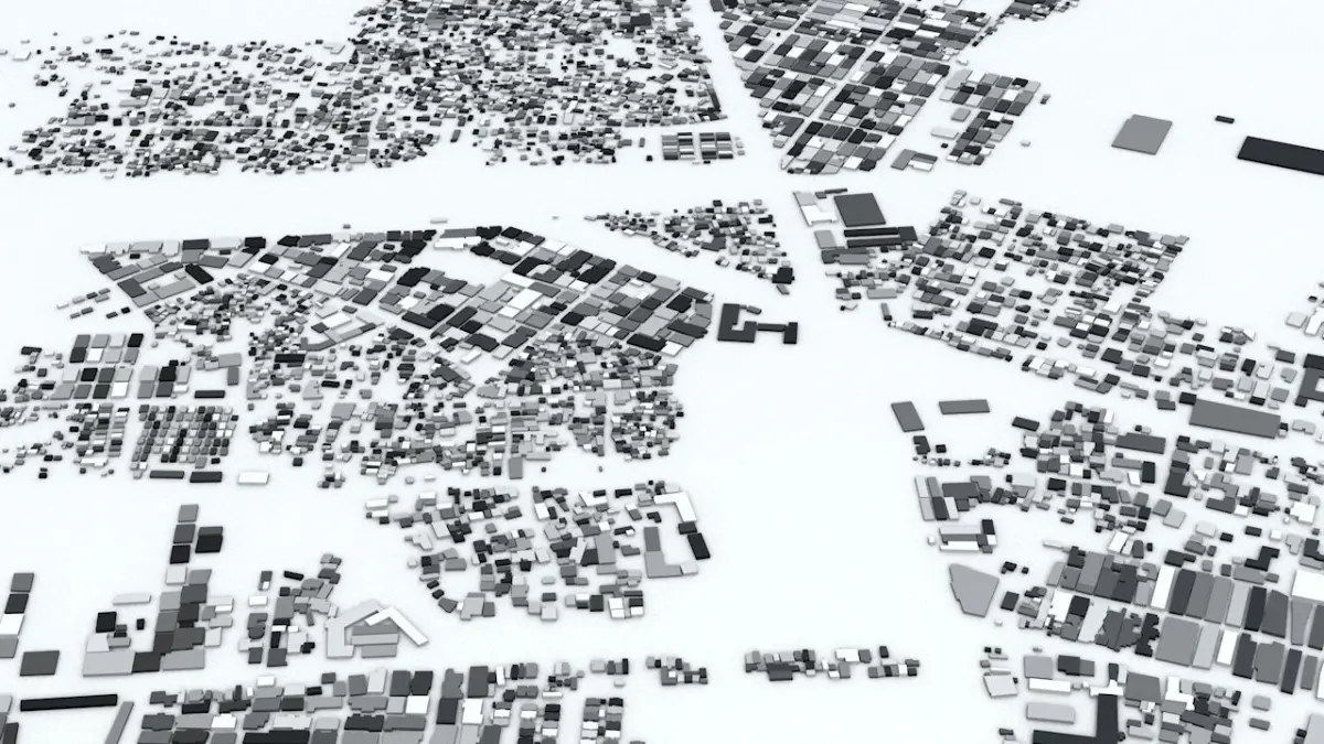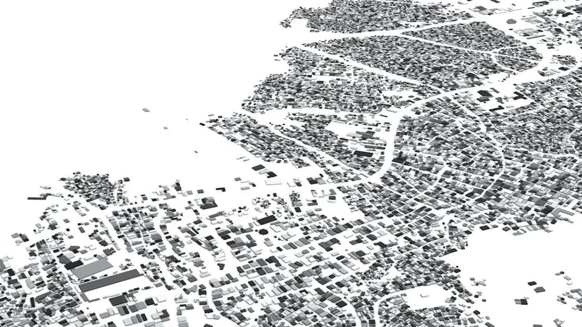 - the model is positioned on a flat surface (all buildings are on the “floor” - no elevation data included)