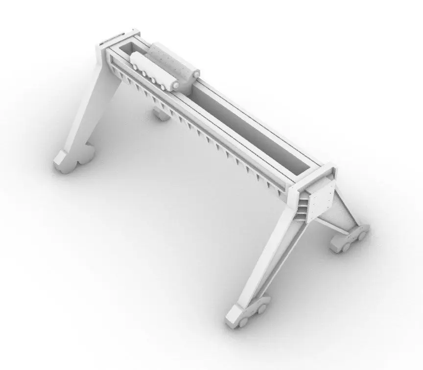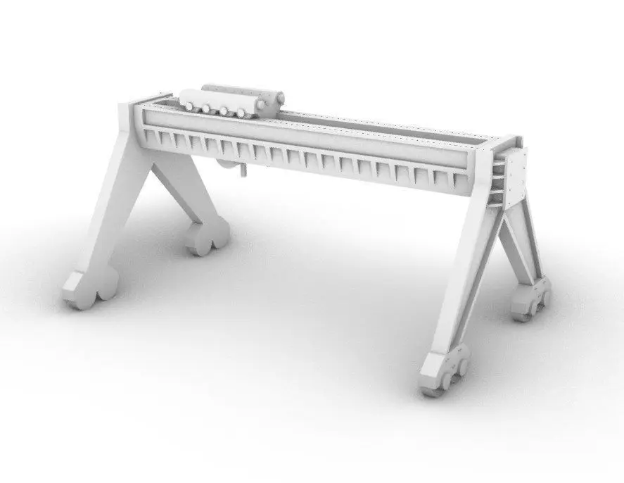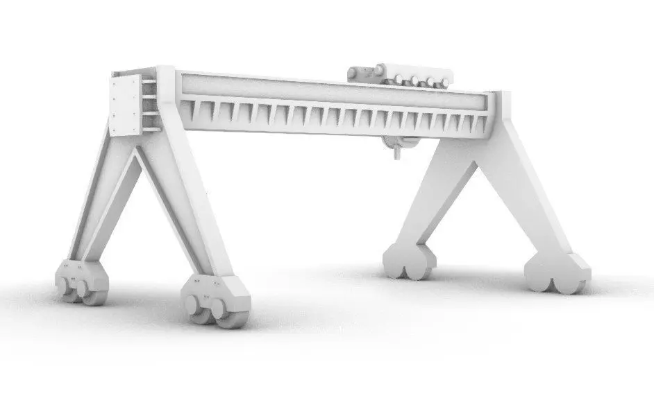 Port crane for tabletop miniature sceneries, dioramas and low poly gaming, design, animation. Includes 4 models, wheeled symmetrical crane shoulders, carriage rail with winch and coil for carriage line. Ideal for construction modern, interwar and scifi settings over plastic, paper and cardboard sceneries.