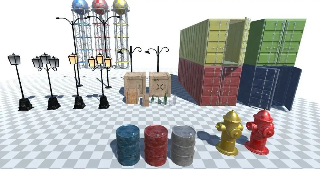 4 types of wooden boxes , 4 Cubic Container with different colors , 2 FireHydrunt , 3 barrel , 3 water tankers , bottles and broken bottles 4 types of StreetLamps .