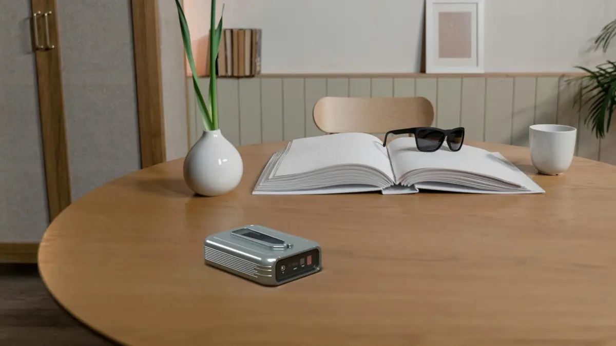 An innovative portable jump starter in a futuristic silver hue, with a high-gloss metallic sheen. The device boasts a modern design and cutting-edge technology, ideal for automotive use in the current era.