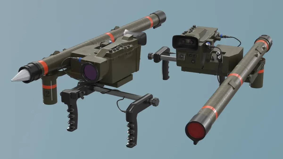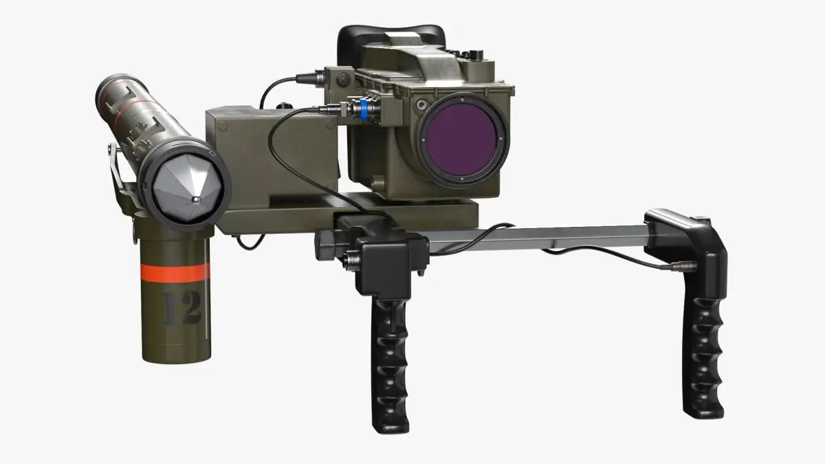 This model showcases a launcher with a complex design, featuring a targeting system, control interface, and ergonomic grips. It's detailed to reflect realistic components such as the guidance mechanism, missile tube, and sighting optics, providing an accurate representation of actual military technology.