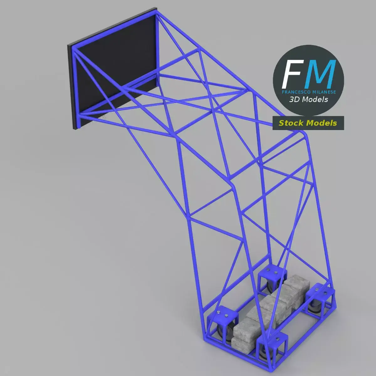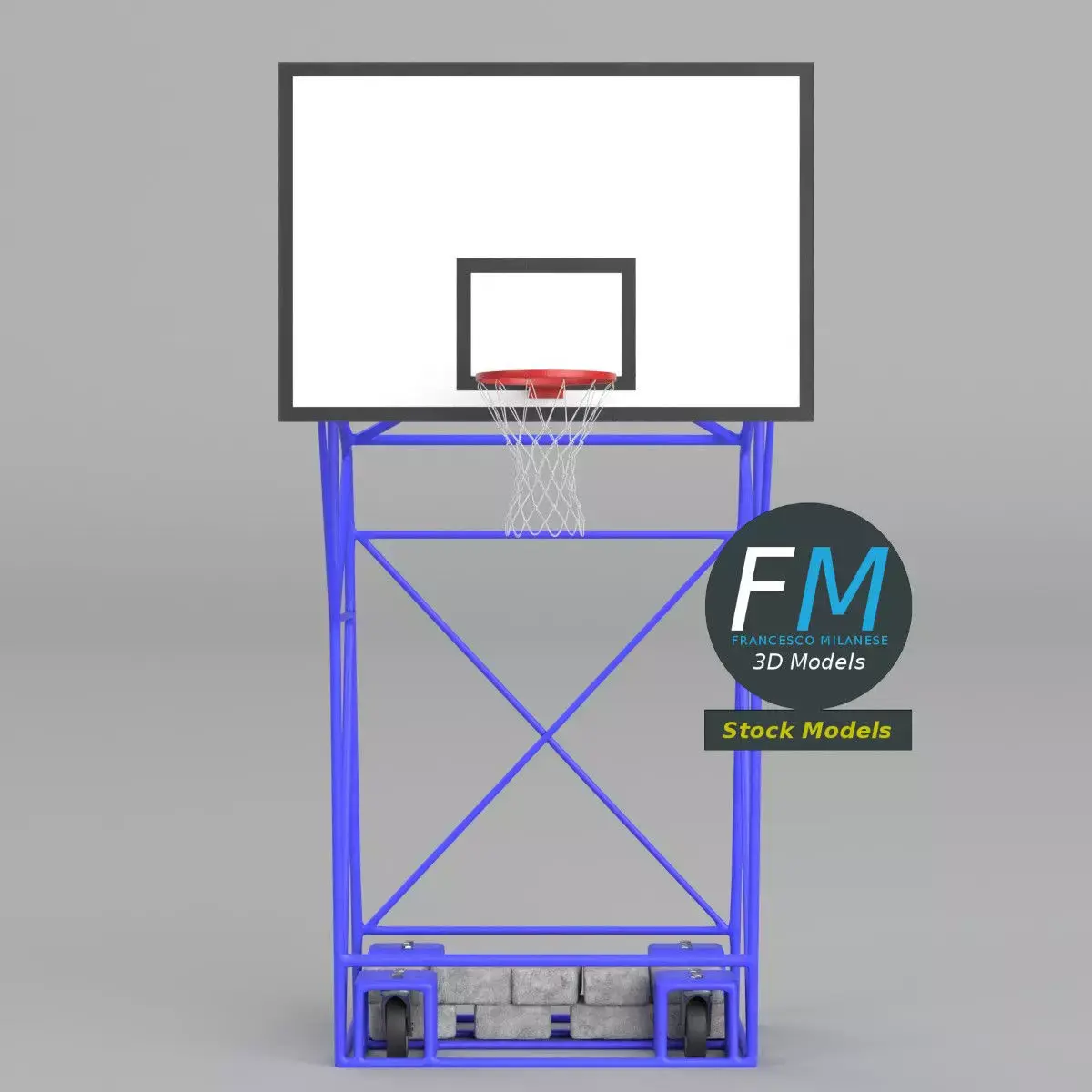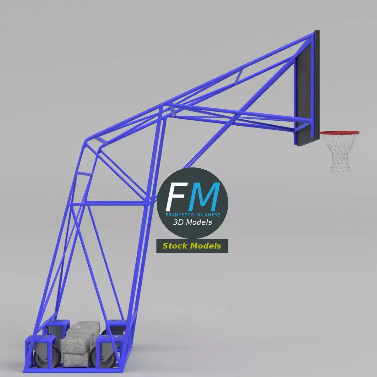 Heavy-duty portable basketball hoop, with steel frame and counterweights, 3D Model. 7 objects (4 wheels, 1 net, 1 frame, 1 counterweight), sharing 3 Materials (frame and wheels; net and backboard; counterweight) with non overlapping UV Layout maps and PBR Textures sets. Production-ready 3D Model with non overlapping UV Layout map provided in the package. PBR Materials and Textures (Metallic Workflow: Base Color, Metallic, Roughness, Normal) embedded in the Blend, FBX, and GLB files.Easily customizable: UV unwrapped geometries; UV Layout maps provided in the package as png with alpha images.Quads-only geometry.Made with Blender 4.5 LTS with Cycles Principled BSDF (PBR, Metallic Workflow) Material, then exported to other formats (OBJ, FBX, GLB; FBX and GLB have embedded textures).Promo images: some renderings made with Cycles for Blender, plus Wireframes and Blender screenshots (Object Mode, Edit Mode with UVs).Formats included: FBX with embedded PBR Textures (Metallic Workflow: Base Color, Metallic, Roughness, Normal), GLB with embedded PBR Textures (Metallic Workflow: Base Color, Metallic, Roughness, Normal), OBJ; scenes: BLEND (with Cycles Principled (PBR) Materials); other: 16-bit PNGs with Alpha.7 Objects (meshes), 3 PBR Materials, UV unwrapped (non overlapping UV Layout map provided in the package).UV Layout maps and Image Textures resolutions: 2048x2048.Polygonal, QUADS-ONLY, 33208 vertices, 33007 quad faces (66014 tris).Real world dimensions; scene scale units: METERS in Blender 4.5 LTS (that is: Metric with 1.00 scale).Uniform scale object (scale applied in Blender 4.5 LTS).PBR Textues included: in a zipped folder, you'll find the PBR Textures set (as 16-bit PNGs with Alpha).IMPORTANT --- Main renderings made with Blender 4.5 LTS + Cycles using an HDR Environment Texture Image which is NOT provided in the package!