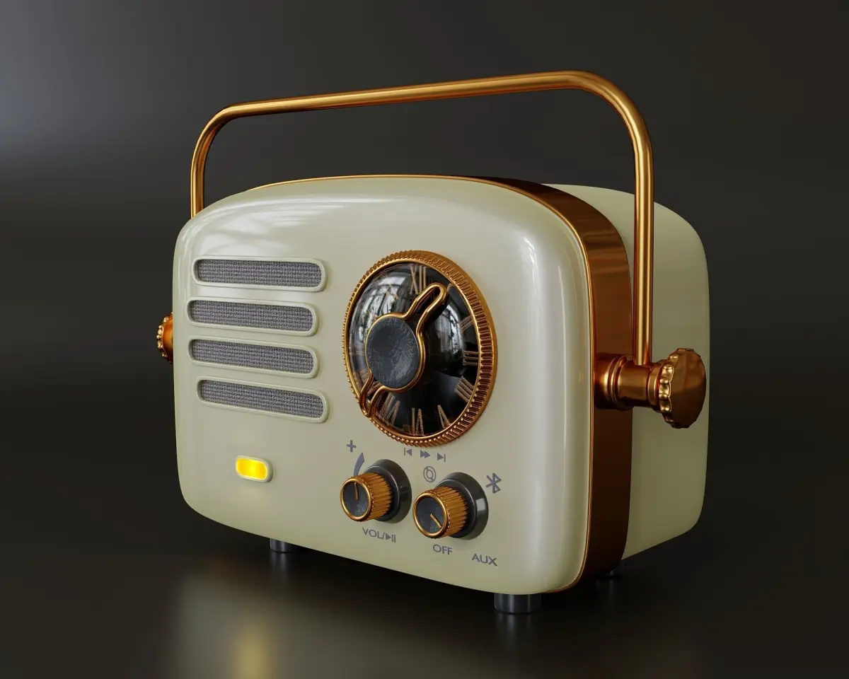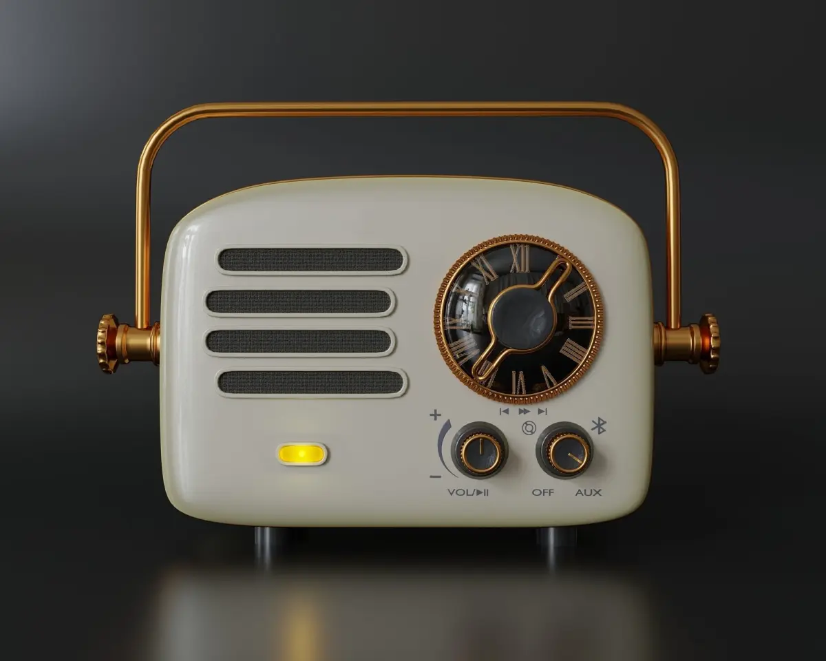 This portable radio comes in retro moonstone style with a metal handle that can be used as a stand or for carrying. Xiaomi Elvis Presley Atomic Player 2 has a 52mm driver that produces high-quality sound in a wide frequency range. The smart radio can be tuned to 12 stations using the app and then selected using the main rotary switch. The radio connects to the phone via Bluetooth or 3.5 mm. headphone input.charging via micro USB.radio dimensions - 148 × 75 × 104 mm.speaker - broadband, diameter 52 mm.weight - 425 gr.battery capacity - 2600 mAh The model consists of several objects. All of them are tied to the main body. The portable handle can be rotated to the stand positionAll materials native blender