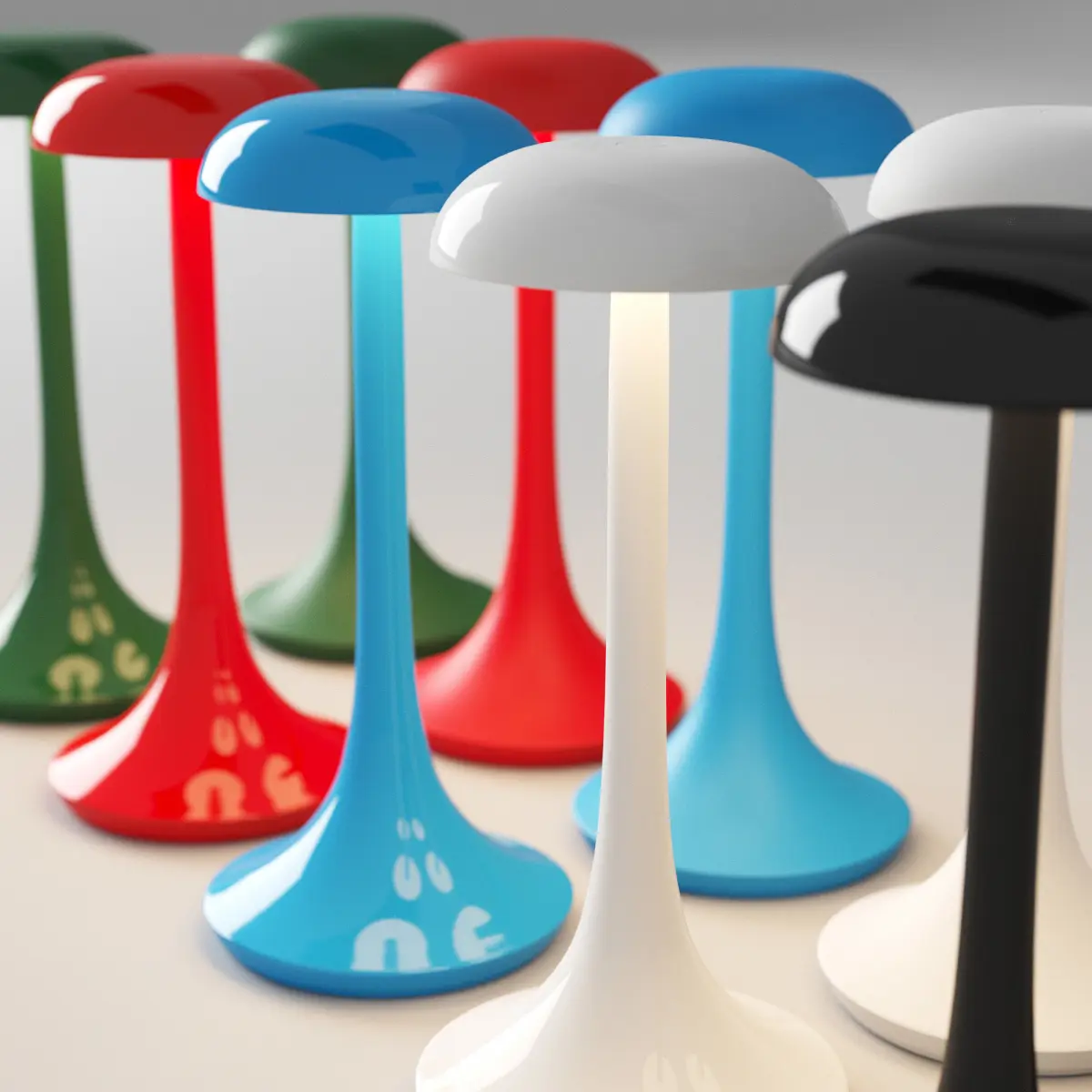 There are 10 lamps in the archive. Matte and glossy surface. 5 colors.Dimensions: Ø - 12 cm, H - 26.5 cm.Color temperature - 2700K.Light source - LED.