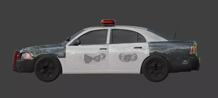 The model captures a professional level of macabre detail, from the shattered, spiderweb-cracked windshield to the occult sigils and demonic symbols drawn on the roof and hood. Every element is meticulously crafted to ensure a polished yet haunted appearance, making it an ideal centerpiece for horror-themed open-world games, cinematic supernatural renders, or gritty urban environment builds. Provided on an isolated white background, this possessed interceptor is ready to bring a sense of high-speed dread and authoritative mystery to your creative projects.
