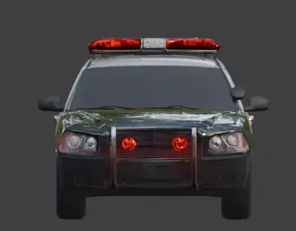 Tagshorror car, police car, haunted vehicle, possessed, demonic, modern interceptor, 3d model, game asset, dark fantasy, weathered, patrol vehicle, halloween, creepy, cracked glass, glowing lights, realistic, blood stained, urban horror, death, 3d prop