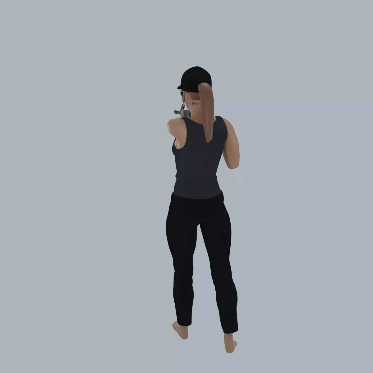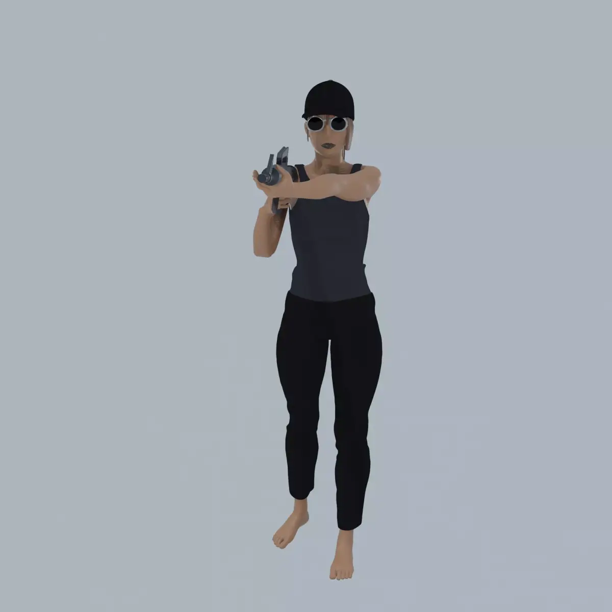 A stylized 3D female character stands barefoot while aiming a modern rifle. She wears a black baseball cap, round sunglasses, a fitted dark tank top, and black pants. Her pose is focused and steady, with her ponytail hanging behind her. The overall style is semi-realistic, with smooth surfaces and simplified details typical of game-ready characters.