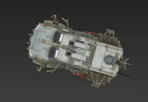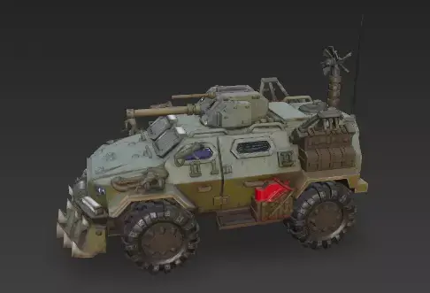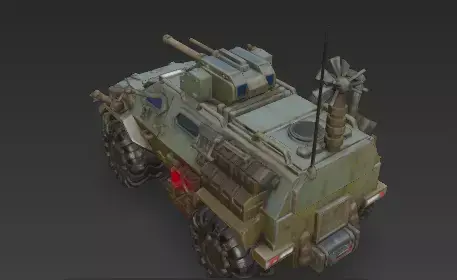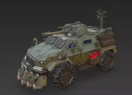 A highly detailed and unique 3D model of a futuristic armored car, designed for a post-apocalyptic or rugged environment. The vehicle features a low-profile, angular chassis with overlapping plates of dark, brushed metal and carbon fiber. It is equipped with a formidable front ramming bumper, reinforced off-road wheels, and integrated LED light bars. The design emphasizes both protection and performance, with a blend of sleek lines and utilitarian elements. The clean, neutral background makes this model ideal for texturing and rendering in various 3D software.