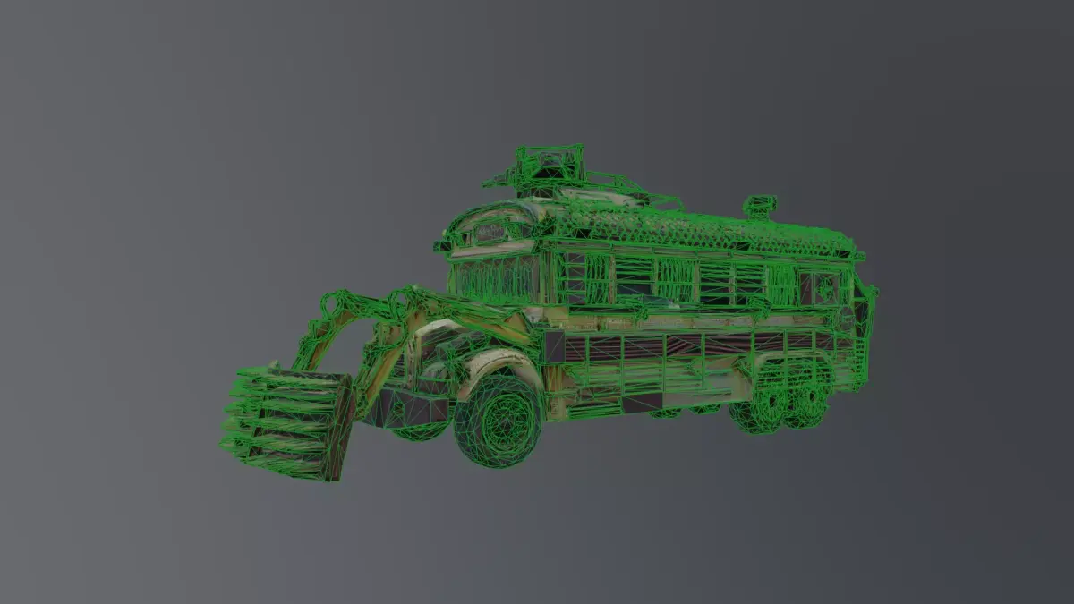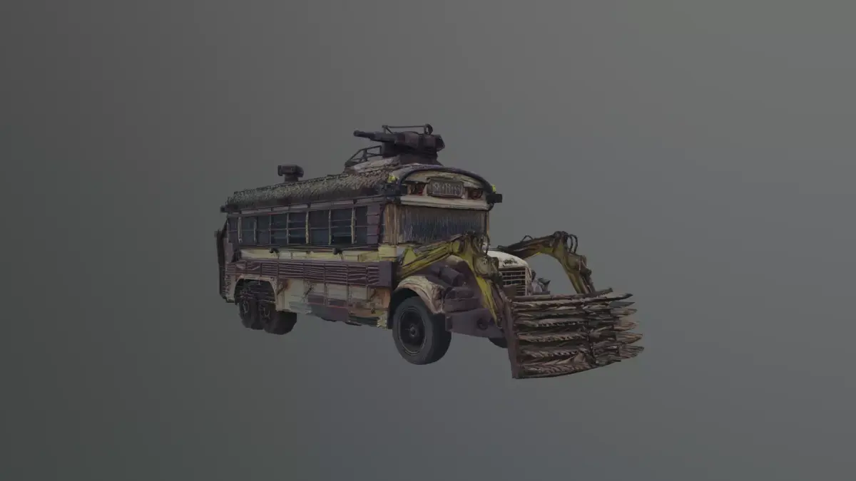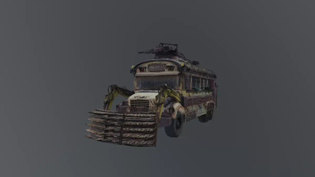 A rugged, post-apocalyptic armored bus designed for harsh survival environments. This vehicle features heavy modifications including reinforced plating, makeshift armor, and industrial attachments, giving it a gritty, battle-worn aesthetic.