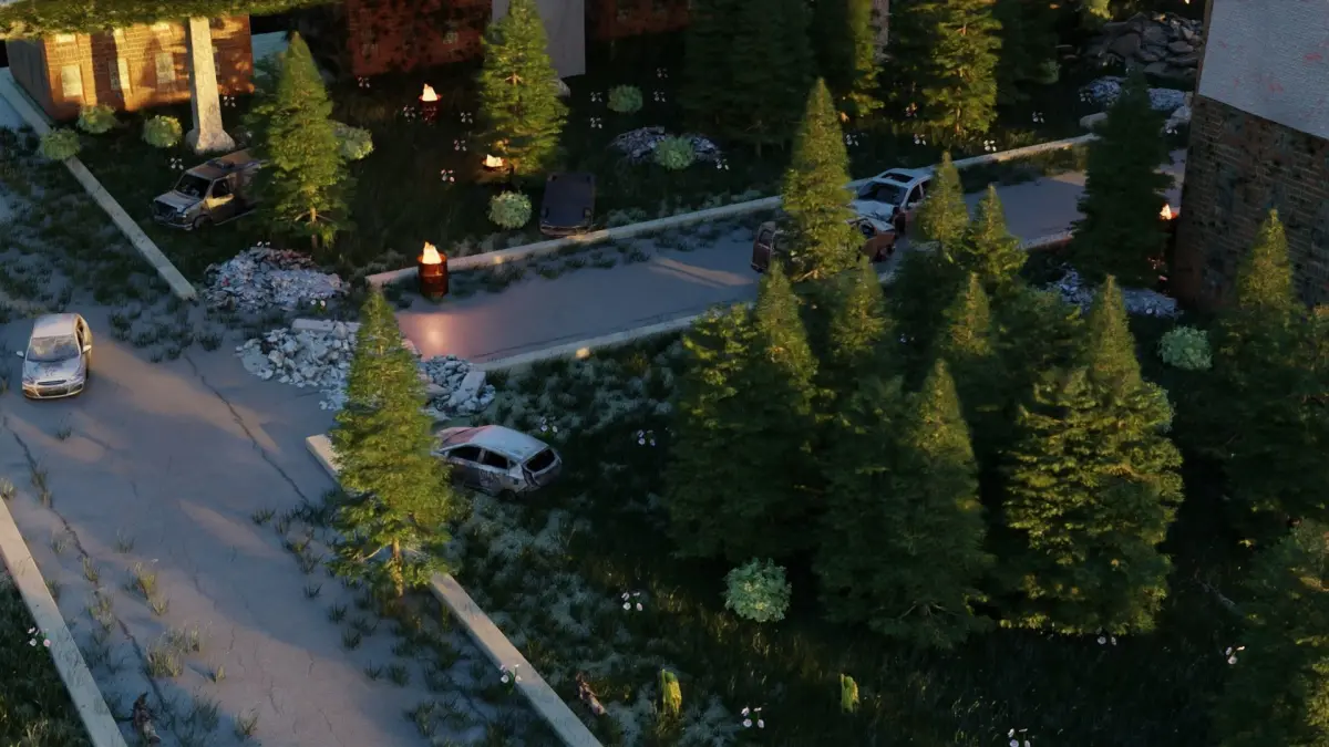The scene is well detailed, with lots of vegetation, 4k and 2k textures, and a lot of detail, can be used anywhere, but the current file is missing the textures of the vehicles and piles of garbage, they were lost.