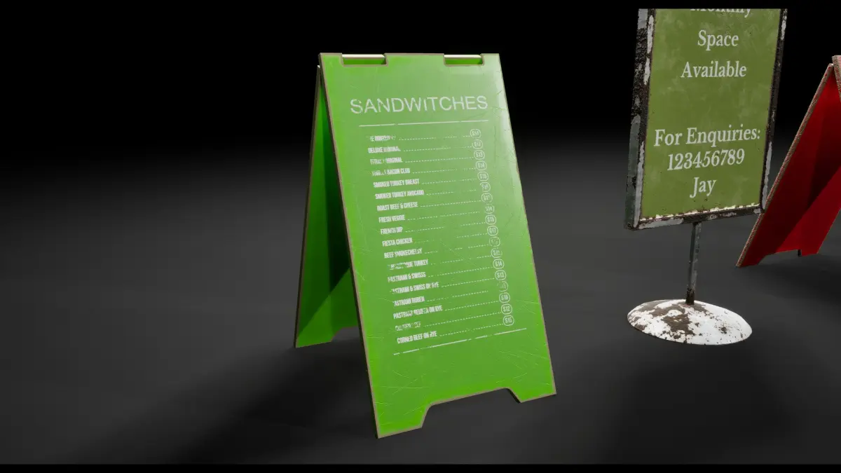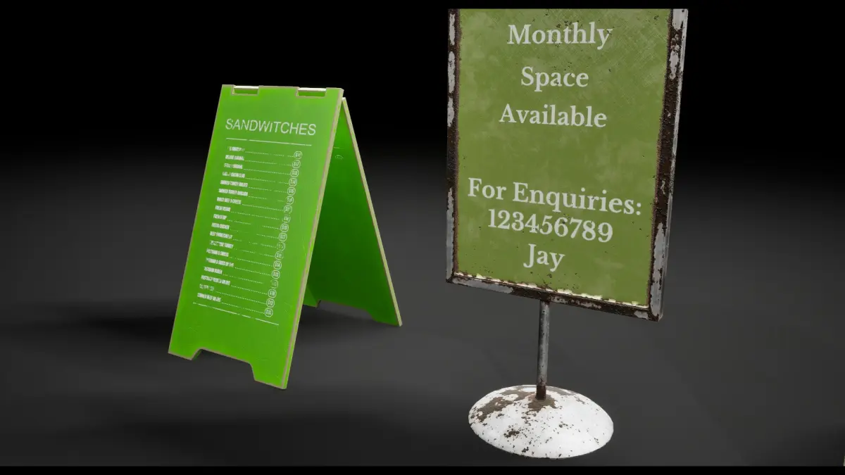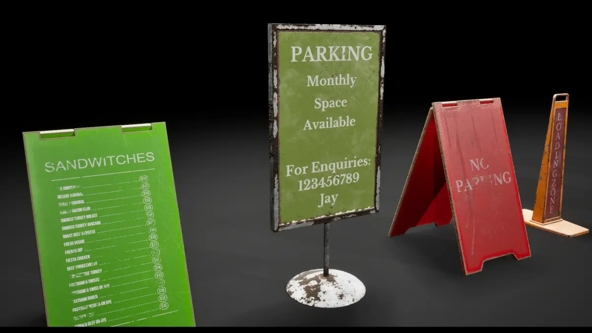 6 Detailed, Optimized, Low-poly, photo realistic post apocalyptic street signs ready to be added to street and sidewalks.
