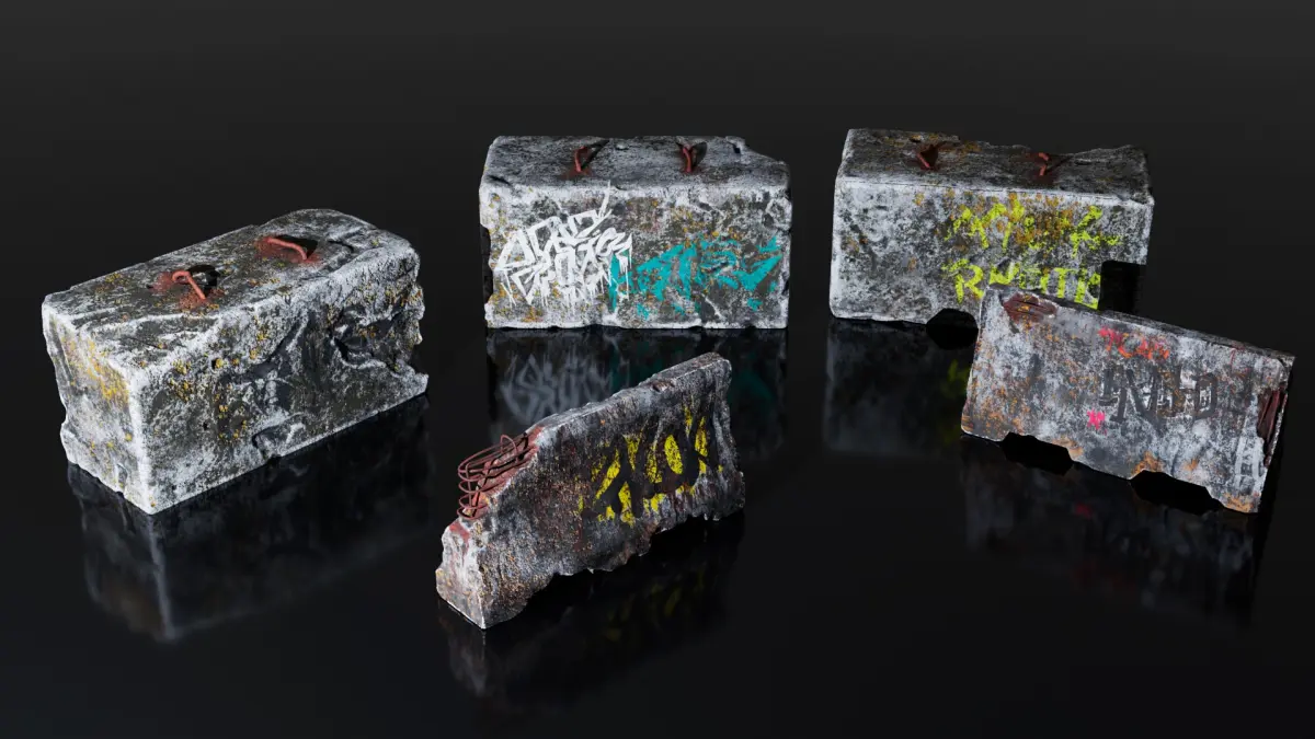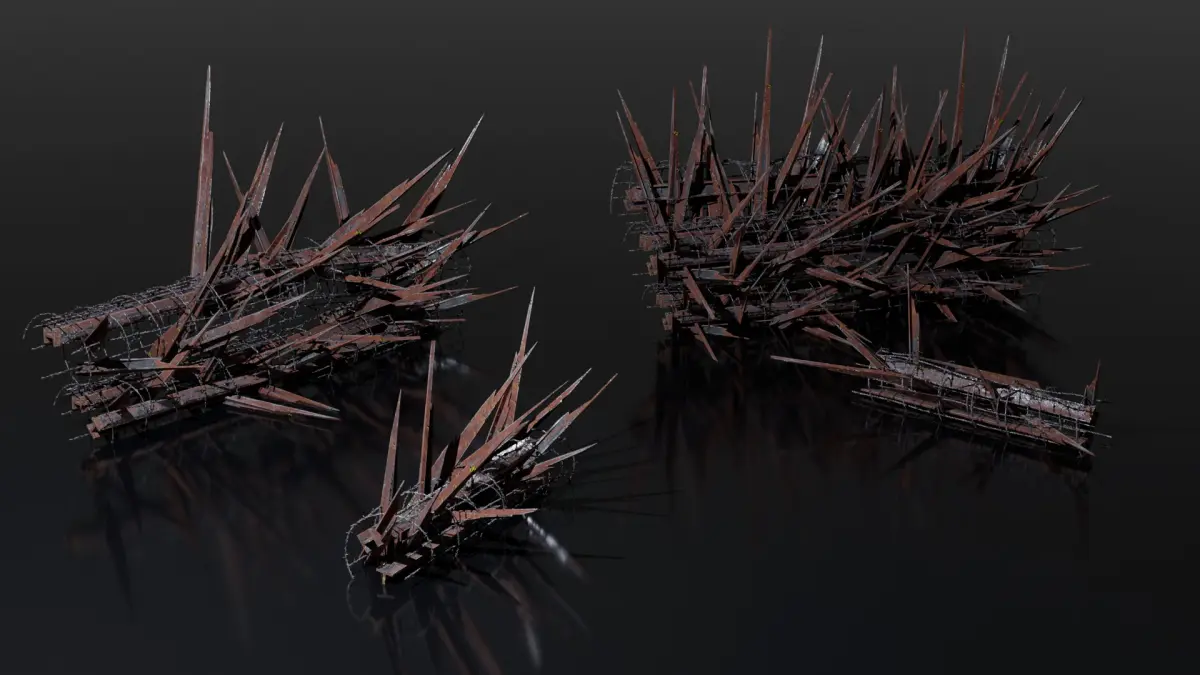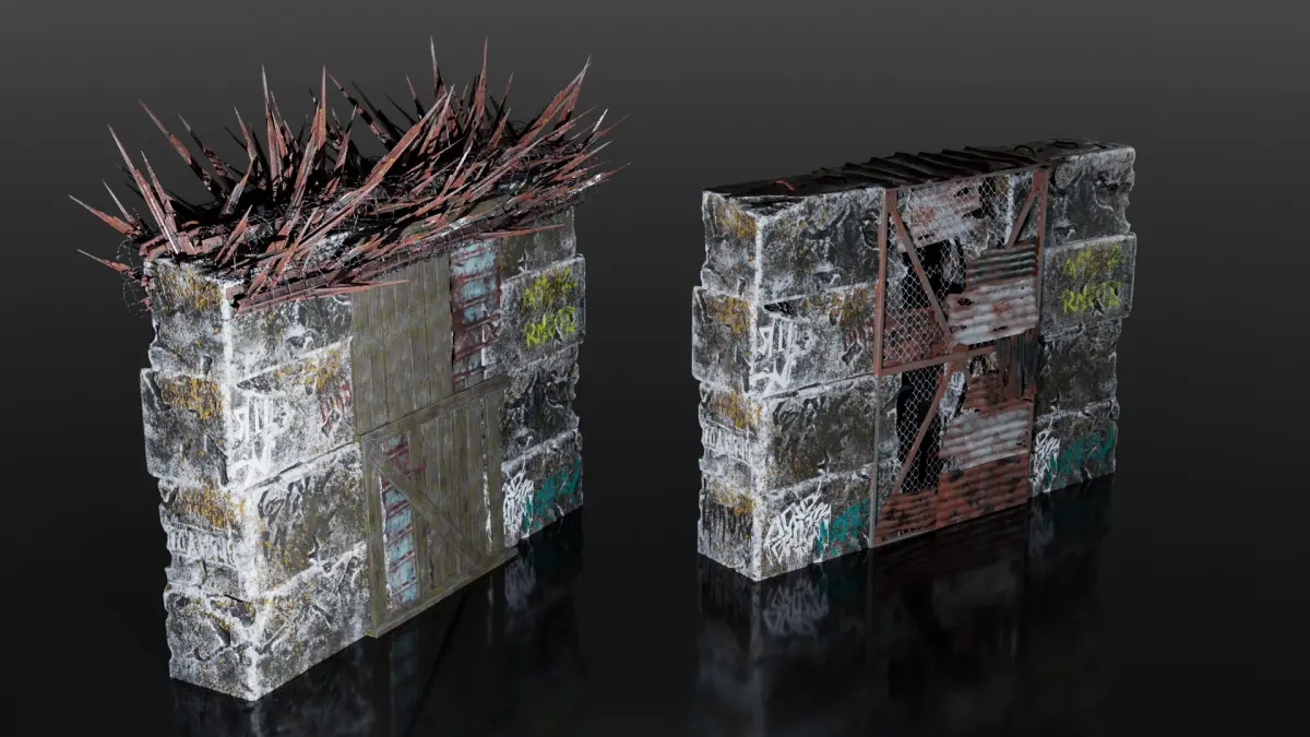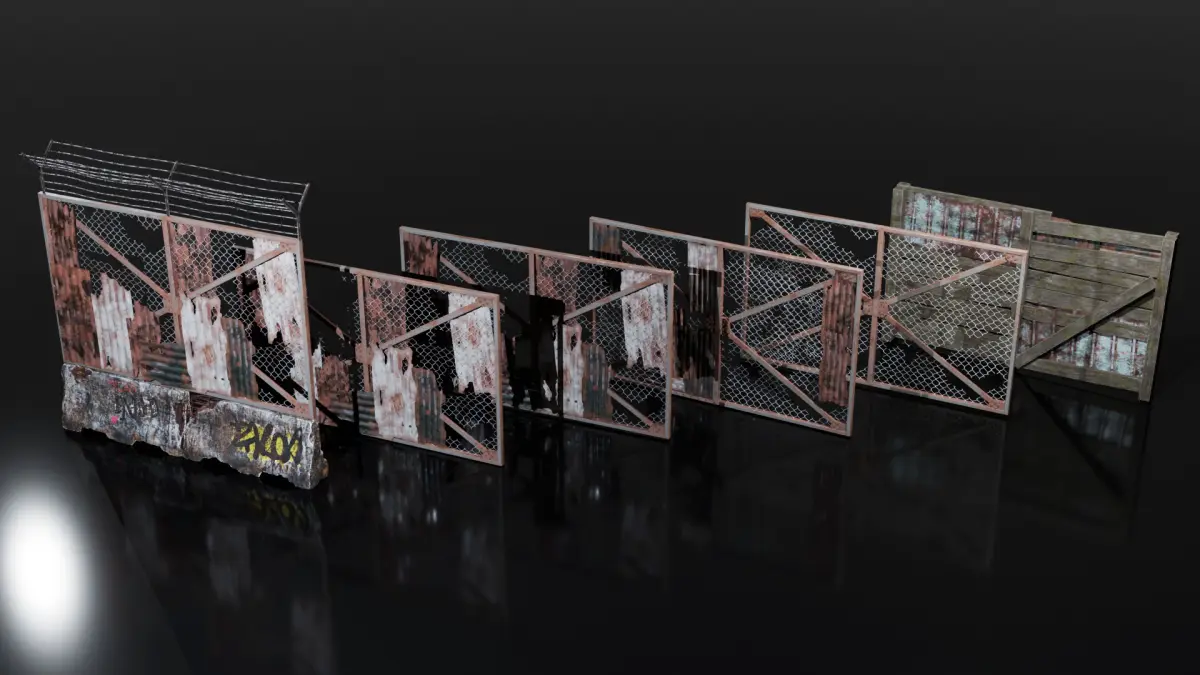 Collection of objects used to make post apocalyptic makeshift barriers, including fences, walls, concrete blocks, spikes and barbed wires.