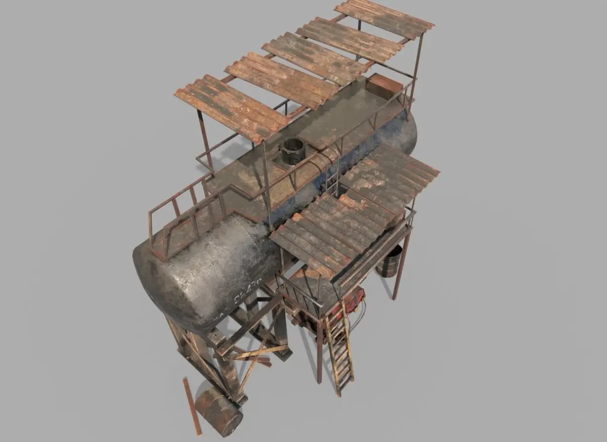 Model of Post-Apocalyptic Oil Station . The whole scene is one mesh. Model is very realistic.It has 5 PBR material.Maps are diffuse-specular-glossiness-height and normal. Model's textures has two sizes; 4096x4096-2048x2048. All maps are PNG formats and unwrapped, non-overlapping.