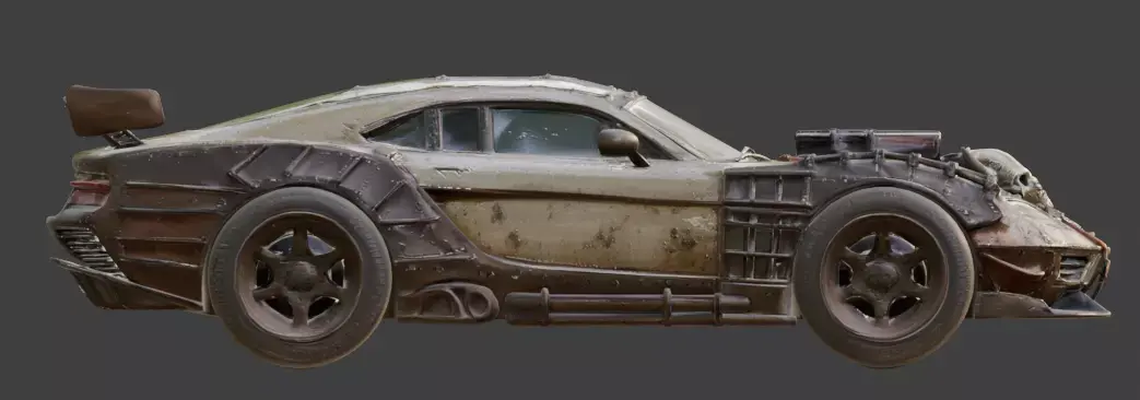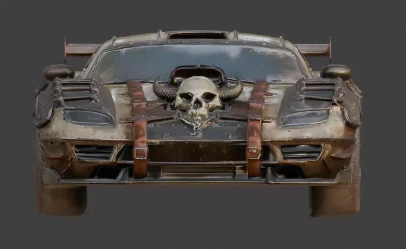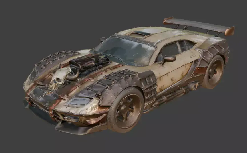 Supercar featuring a heavily customized wasteland aesthetic, blending high-performance aerodynamics with rugged survivalist modifications. The vehicle is reinforced with rusted metal armor plates and leather straps across the hood, securing a prominent horned skull ornament. It features exposed engine components with leather-wrapped detailing and industrial side-exhaust pipes. The body showcases a gritty, sun-bleached paint finish with extensive metallic oxidation and accumulated desert dust. Equipped with a large rear spoiler and performance wheels, this model captures the aggressive look of a high-speed raider vehicle built for the end of the world. This models is suitable for remesh and decimate.