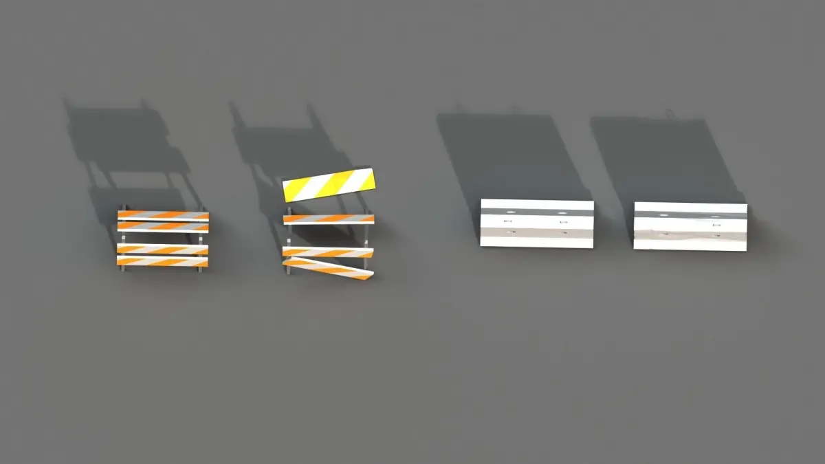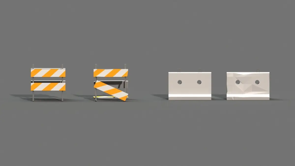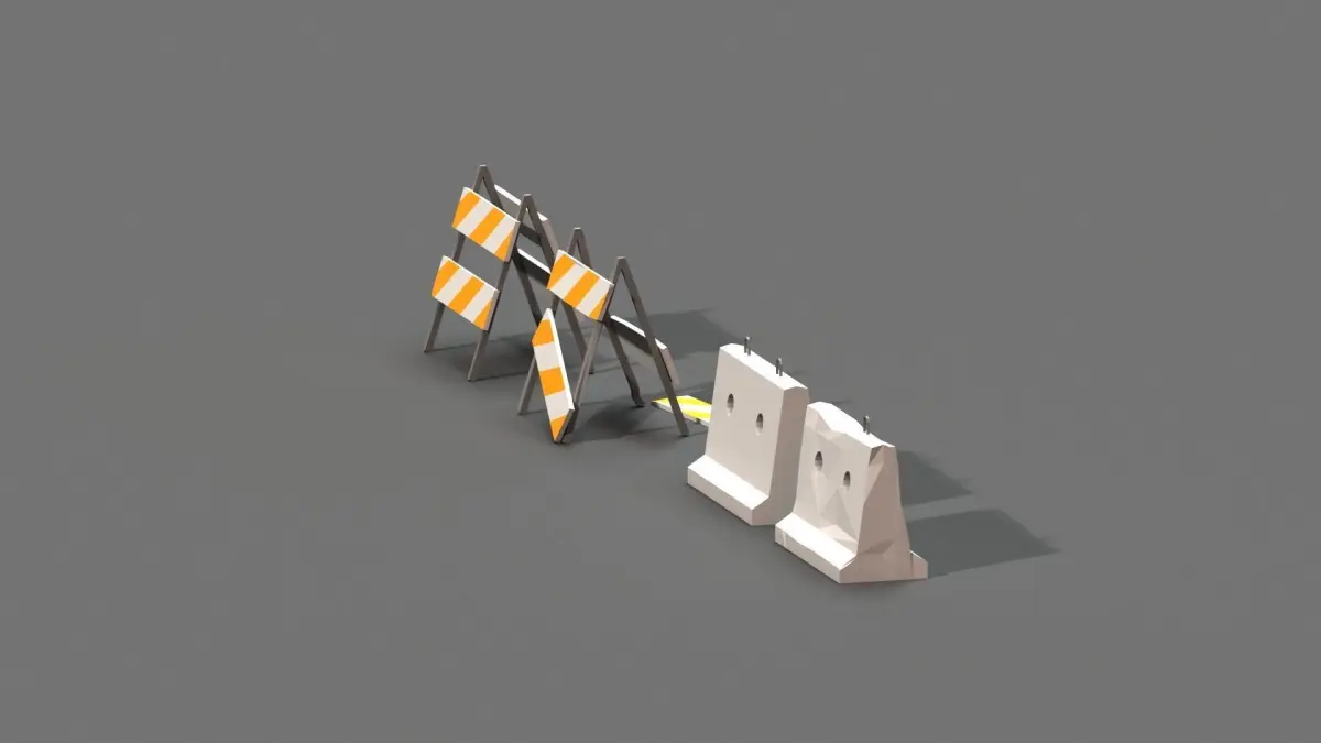 Low poly stylized road block models. This contains a total of four models which are two different road blocks and the damaged versions of them.