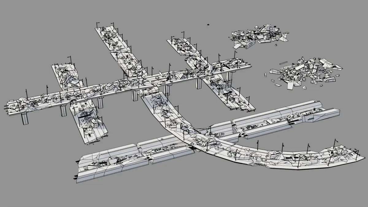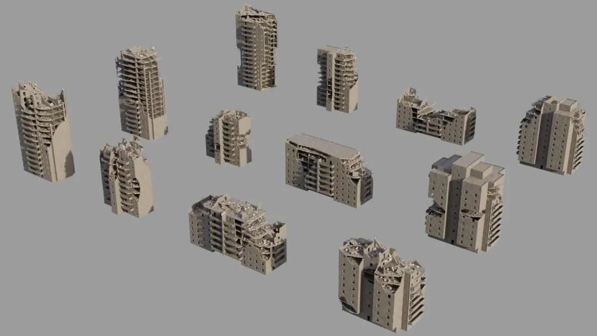 Includes 12 ruined buildings, 7 roads, 2 bridges,3 drainage channels, subway and debris. You can easily change the position of buildings or copy them to create a larger city. Designed to be modifiable.