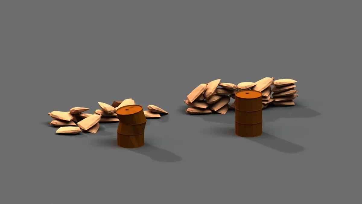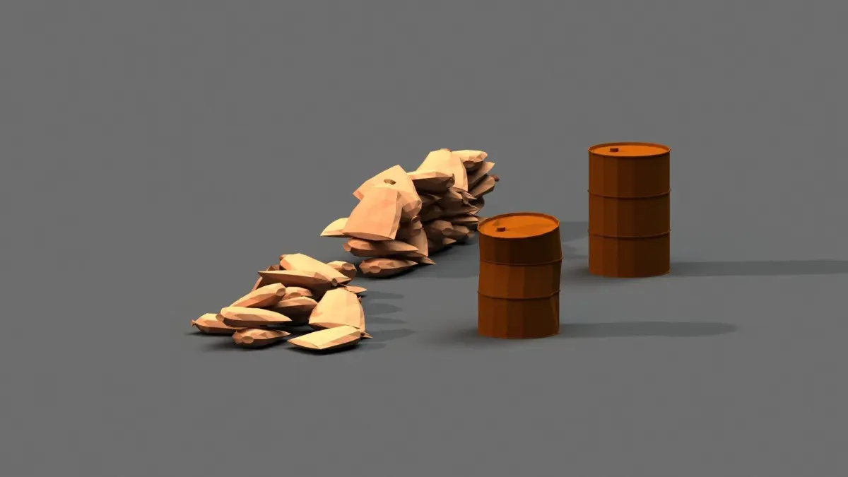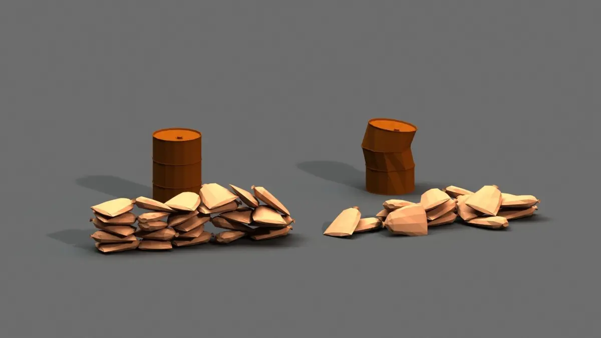 Stacked and scattered versions of low poly sandbag models and barrels where one is not damaged and the other is bent/old/post apocalyptic.