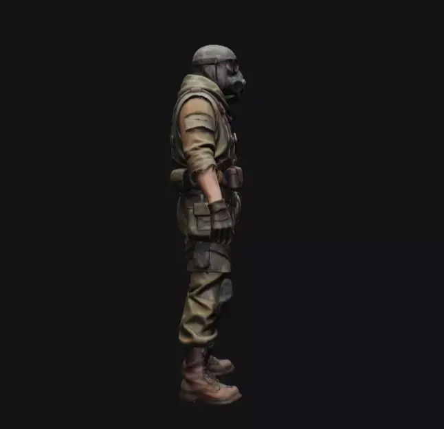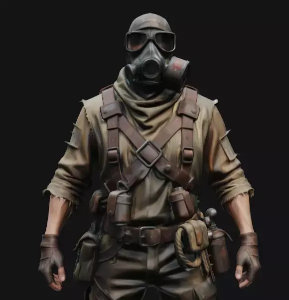 Post-apocalyptic / survival-style character,Gas mask with detailed straps and filters,Tactical outfit with pouches, belts, and knee pads,Realistic proportions and clean topology,Suitable for real-time and cinematic rendering,Ideal for games, films, and environment storytelling