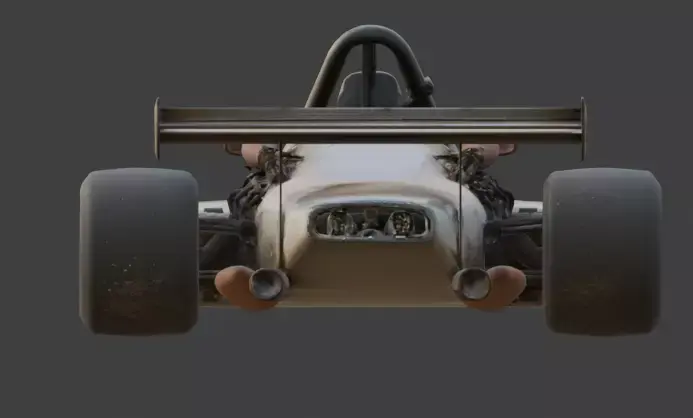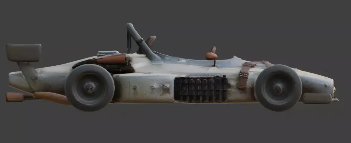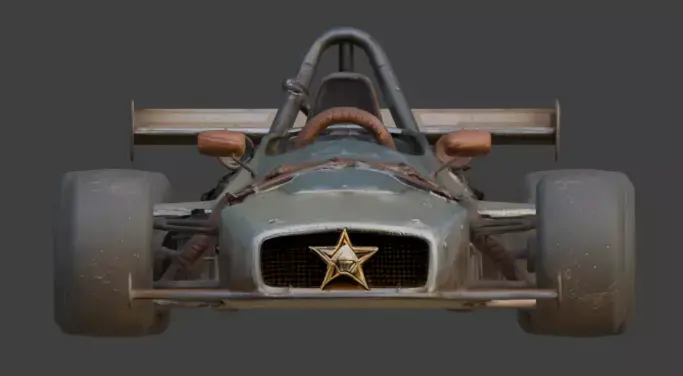 Weathered Racing Geometry: A sleek formula silhouette treated with realistic rust, dust, and metallic oxidation textures.