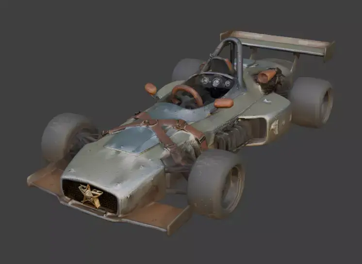 Formula-style racing car featuring a unique blend of high-speed aerodynamics and Wild West survivalist aesthetics. The vehicle is constructed with dusty, riveted metal panels held together by leather belts and buckles. It features a prominent brass sheriff star emblem on the front grille and a wooden dashboard equipped with retro analog gauges. The open-cockpit design includes a leather-wrapped steering wheel and a heavy-duty roll hoop. Supported by an exposed suspension system with visible coil springs, the racer sits on wide, sand-covered slick tires, making it a perfect asset for desert racing or wasteland pursuit scenes. This models is suitable for remesh and decimate.