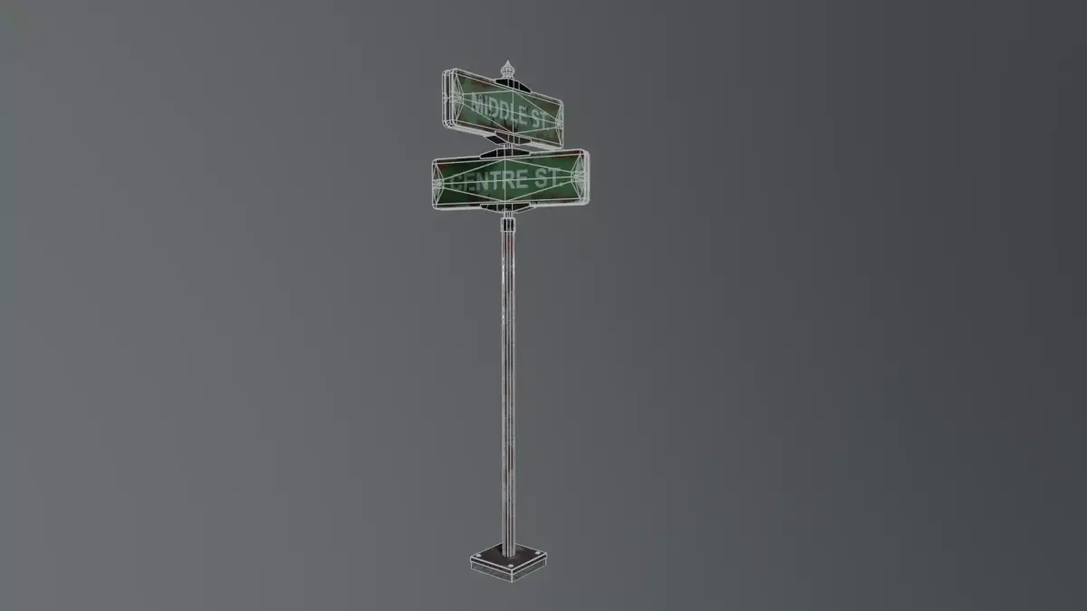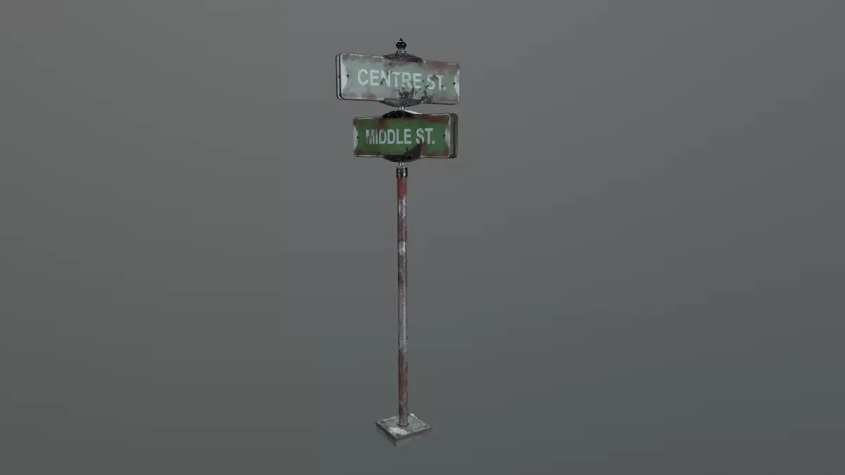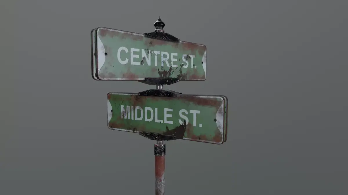 High-quality, Post-Apocalyptic Street Sign Post. Featuring weathered green signs for Centre St. and Middle St., this asset is perfect for ruined cityscapes, survival horror scenes, or abandoned urban environments.