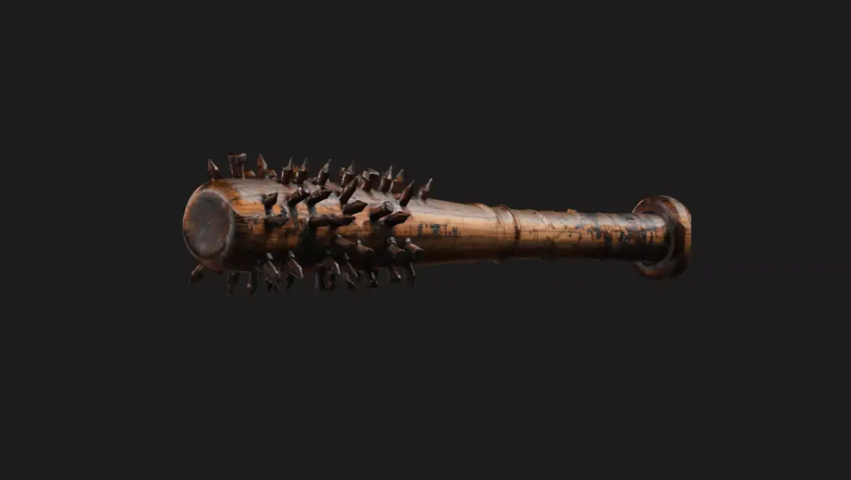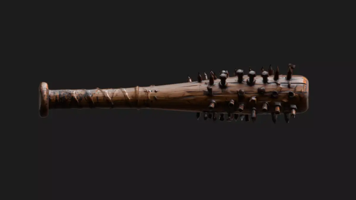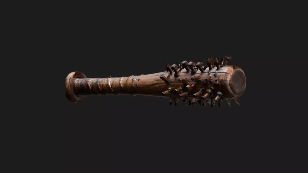 This weapon features a cracked wooden bat reinforced with embedded metal spikes and nails across the striking surface. Burn marks, surface scratches, chipped wood, and darkened metal create a realistic, battle-worn appearance that enhances environmental storytelling. The uneven spike placement and heavy wear give it a brutal, handcrafted raider aesthetic.