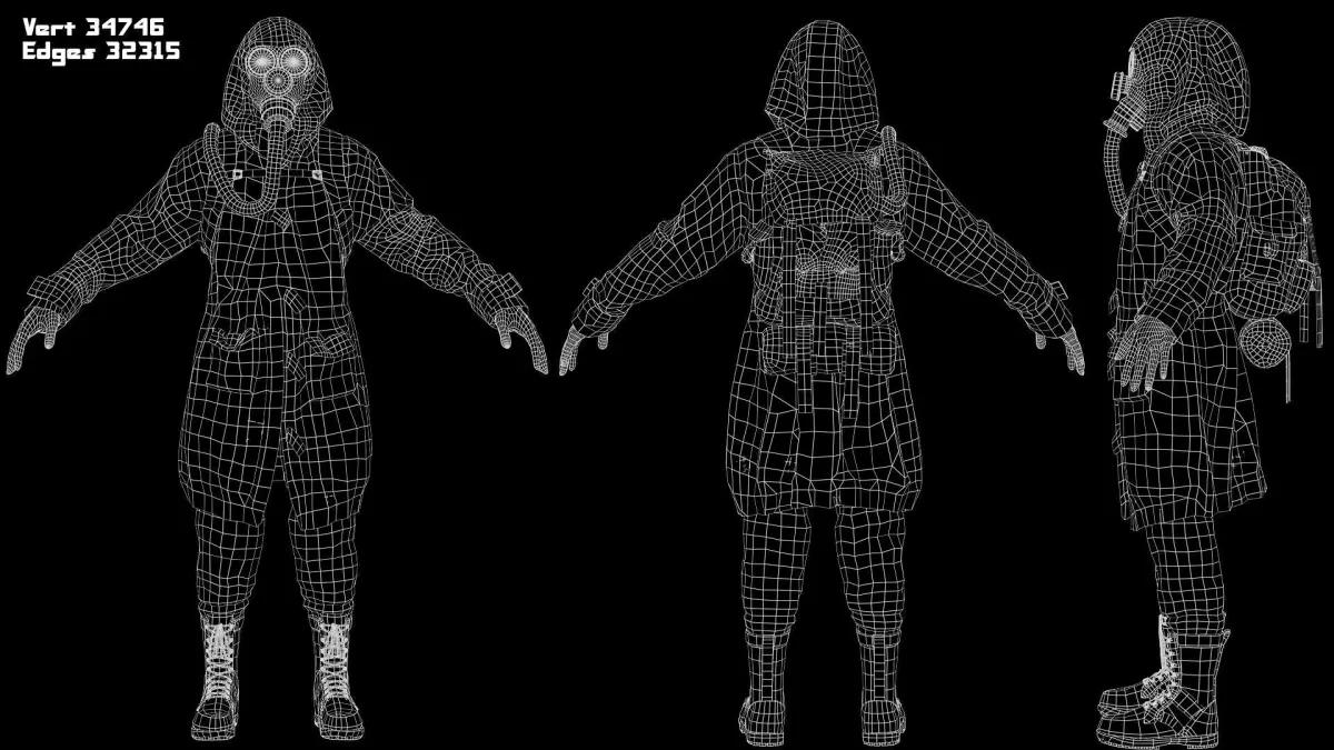 Game ready character for your projects in the style of survival and post-apocalypse, includes 7 standard demo animations in Unreal engine, consists of 4 four parts, a backpack and a gas mask, a jacket, pants and boots, a head and hands.
