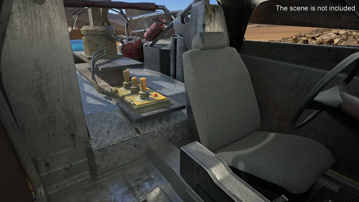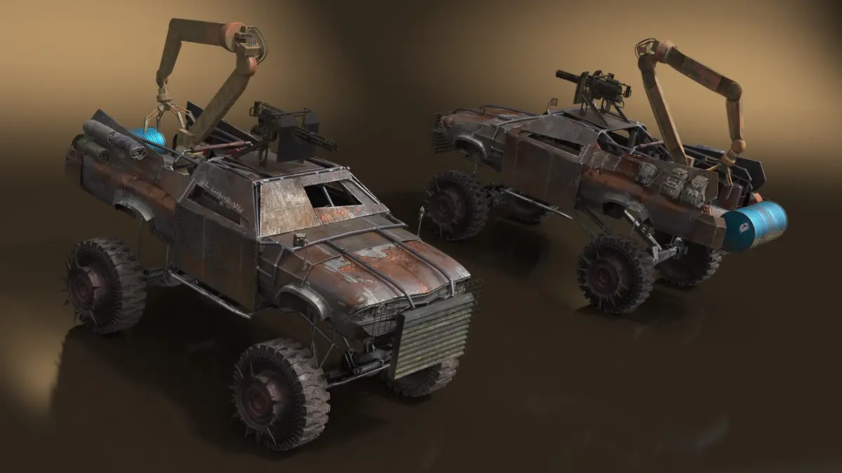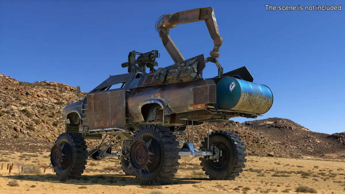 The post-apocalyptic truck is a heavily modified, all-terrain vehicle conceptualized for extreme scenarios in a collapsed world. Characterized by reinforced armor plating, spiked grills, external fuel tanks, and makeshift weapon mounts, it combines salvaged aesthetics with utilitarian design.