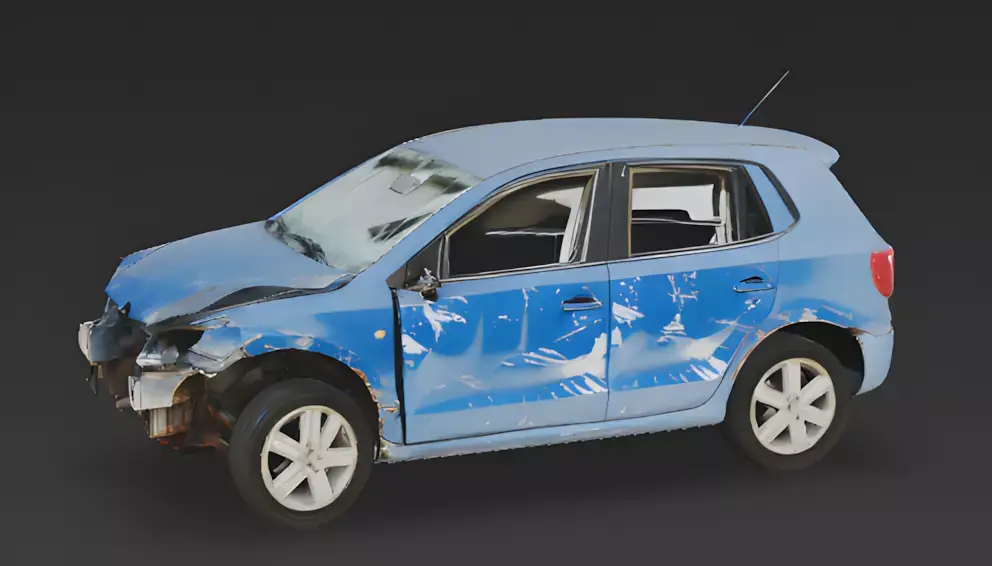 The Overall Concept This asset represents a heavily damaged, blue hatchback designed for post-apocalyptic, survival, or urban catastrophe environments. It tells a story of a violent collision or a long abandonment in a hostile wasteland, making it an ideal environmental prop for storytelling through destruction.