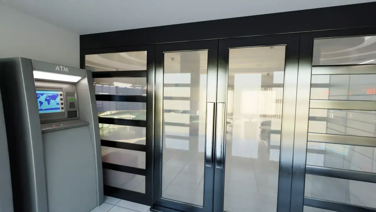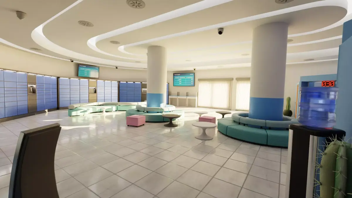 - Includes ATMs, parcel locker, ticket terminal, workstations, cameras, and decor elements