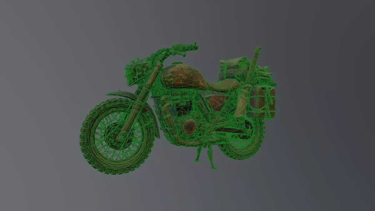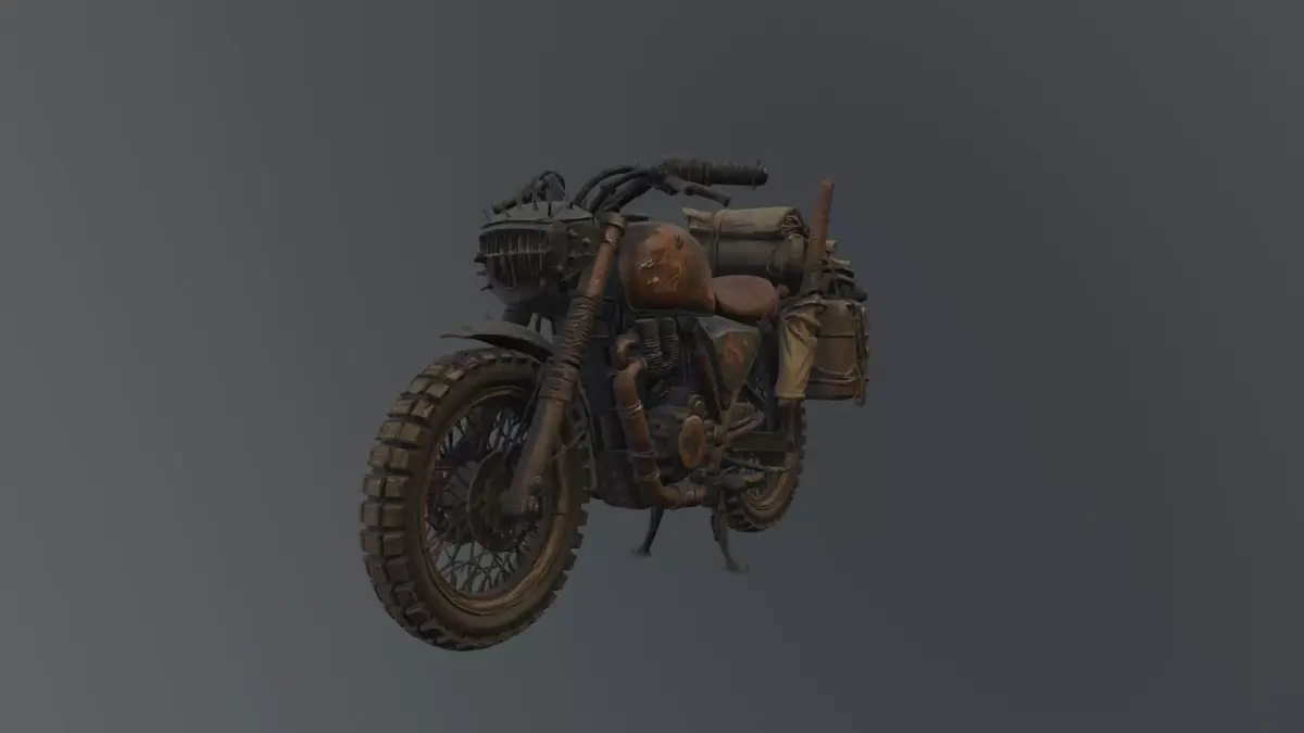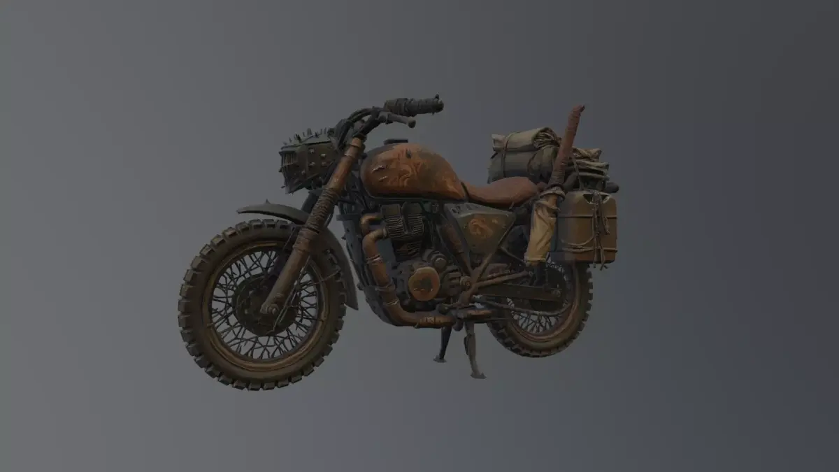 A rugged post-apocalyptic motorcycle equipped with survival gear, featuring a worn fuel tank, exposed engine components, and off-road tires. The bike includes attached storage bags, a side-mounted container, and improvised equipment, giving it a scavenged, survivalist aesthetic. Suitable for wasteland, survival, or dystopian environments.