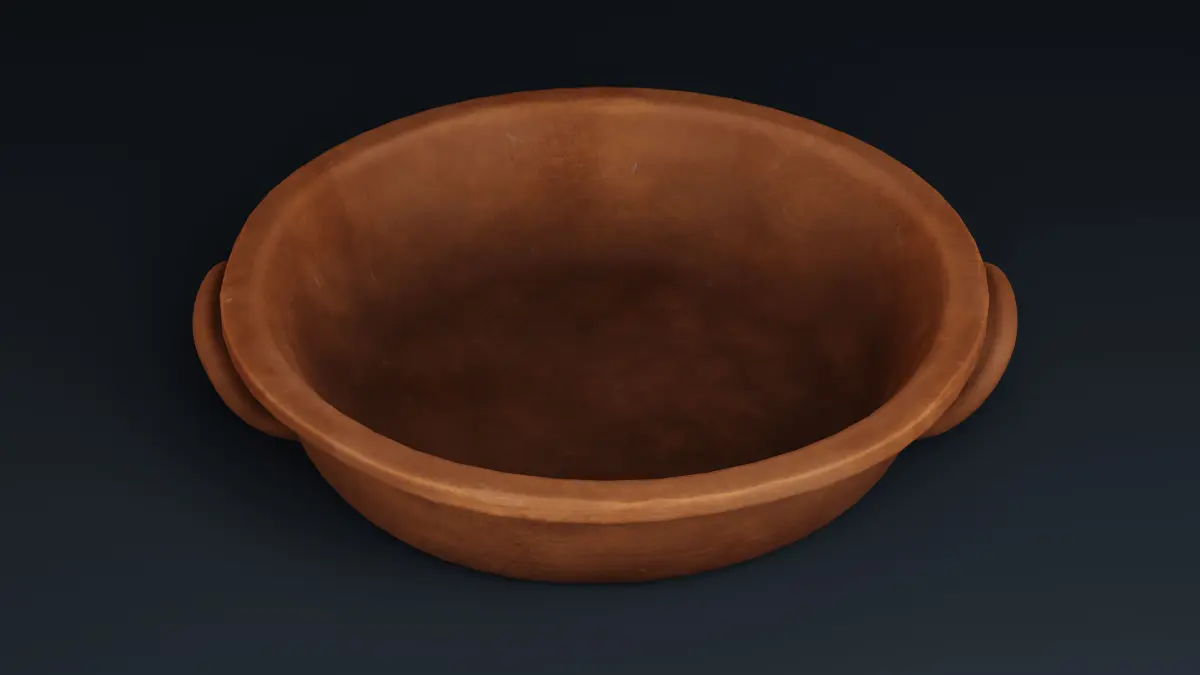 The 3D model of a realistic ceramic dish/pot in a medieval/fantasy theme. You may use it for creating virtual environments such as taverns, inns, kitchens, and feast rooms for many purposes, e.g., concept art, set design, video games, or animation.