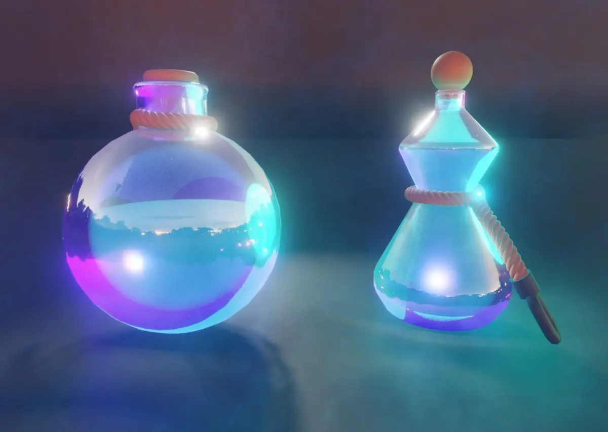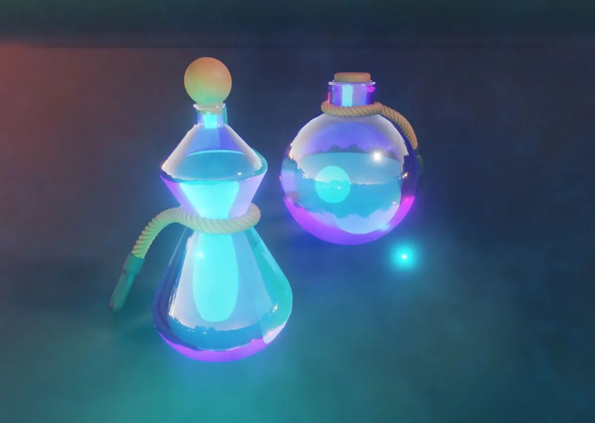 Potions asset scene made in blender 2.9 with custom node groups, unwrapped mesh and textures used in unreal and unity, the thumnail imagewas made in blender, the assets for videogames do not include the lighjting and material setup, only textures without transparency.