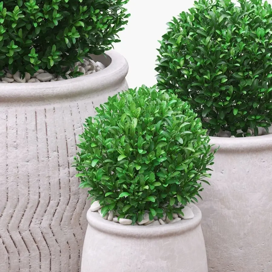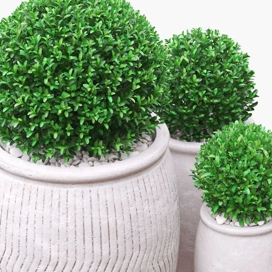 Three small round-shaped buxus (boxwood, european box, common box, buxus sempervirens, american boxwood, common boxwood) bushes 26 - 34cm high in ceramic pots.Buxus is evergreen and very hardy and can be shaped into any form. For gardeners who enjoy ordered and very neat growth without having to do too much maintenance, this plant has become a favourite for containers, low hedges and other topiary.Pots made from white textured ceramics with pebble covering around the trunks.