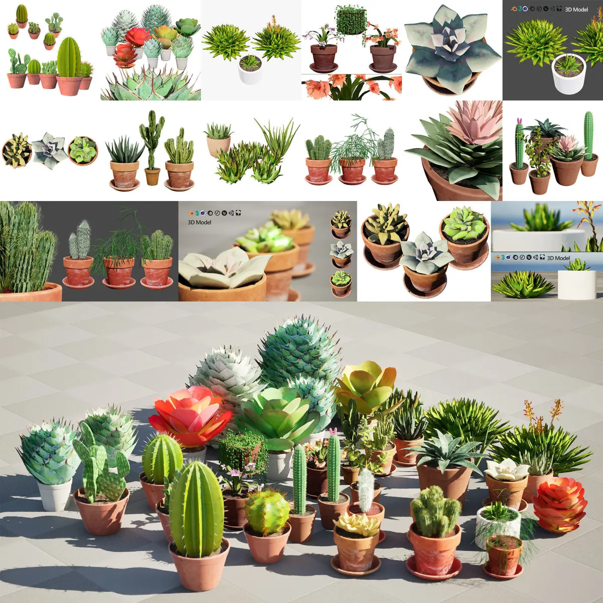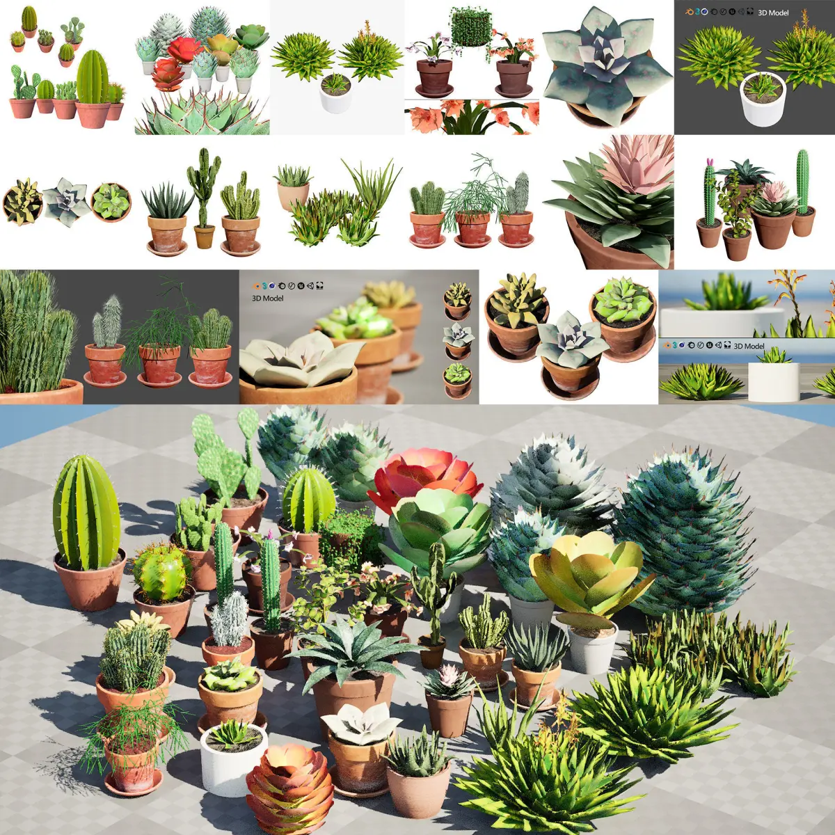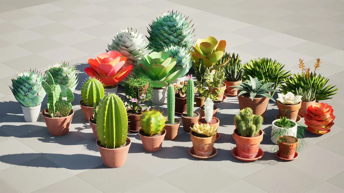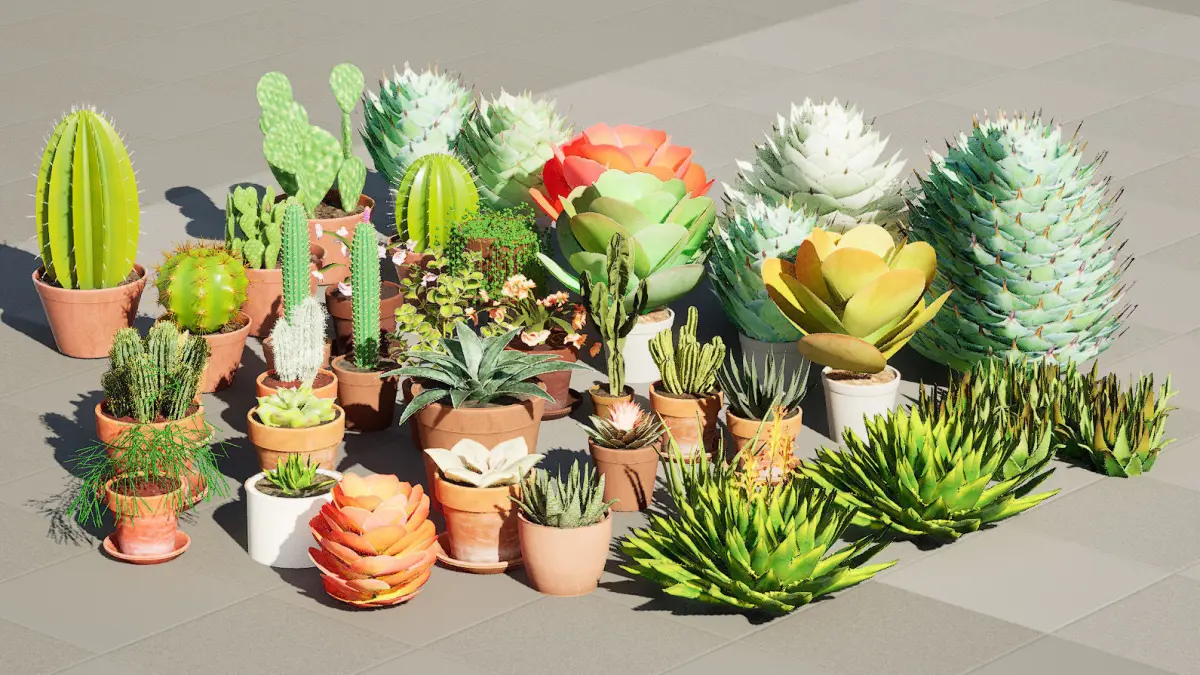 Low-Poly Potted Cactus CollectionThis diverse collection of low-poly potted cacti and succulents is perfect for adding a touch of nature to your virtual environments. With a variety of shapes, sizes, and textures, these assets are ideal for game development, architectural visualizations, or any other creative project.