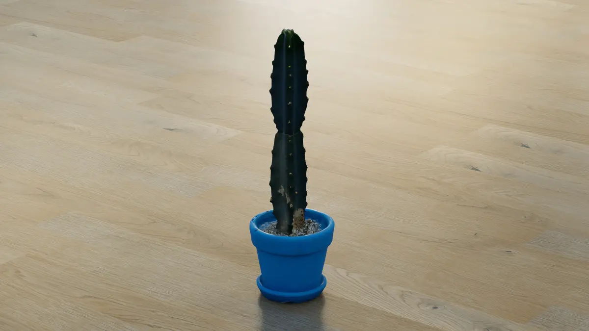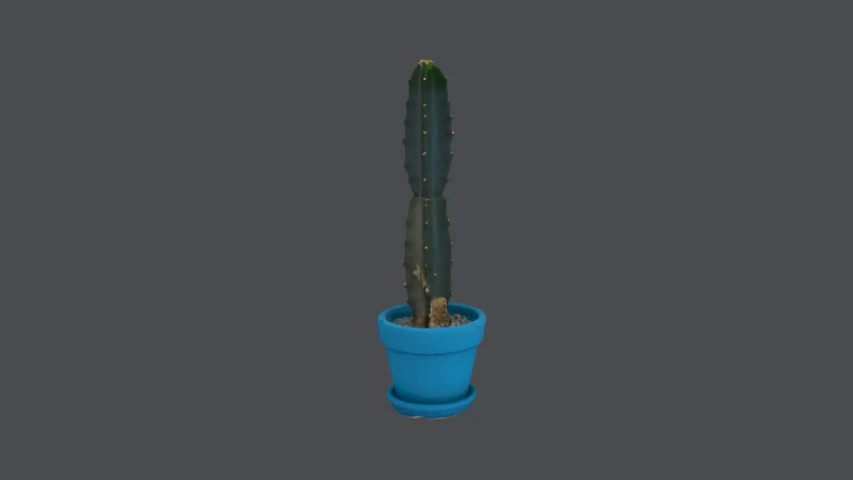 This 3D low-poly model features a minimalist cactus plant in a vibrant blue pot, designed with simplicity and efficiency in mind. The model showcases a tall, ribbed cactus with subtle detailing, perfect for use in virtual environments, games, or decorative renders. Its clean geometry and low polygon count make it an ideal choice for optimizing performance without sacrificing aesthetic appeal. The wooden floor base adds a natural contrast, enhancing the overall visual composition.