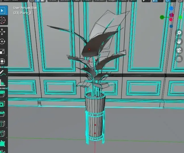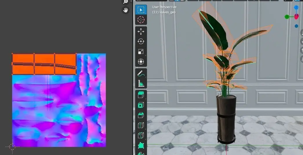 A smooth modifier is applied to the leaves, the pot, and the metal pot holder although smoothing on the pot and metal are not really necessary.